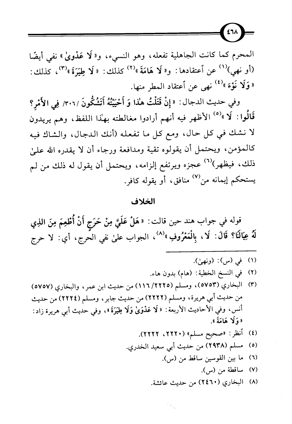 المحرم كما كانت الجاهلية تفعله، وهو النسيء، و"لَا عَدْوى" نفي أيضًا (أو نهي) (¬1) عن اعتقادها: و" لَا هَامَةَ " (¬2) كذلك: " لَا طِيَرَةَ " (¬3)، كذلك: "وَلَا نَوْءَ" (¬4) نهى عن اعتقاد المطر منها.