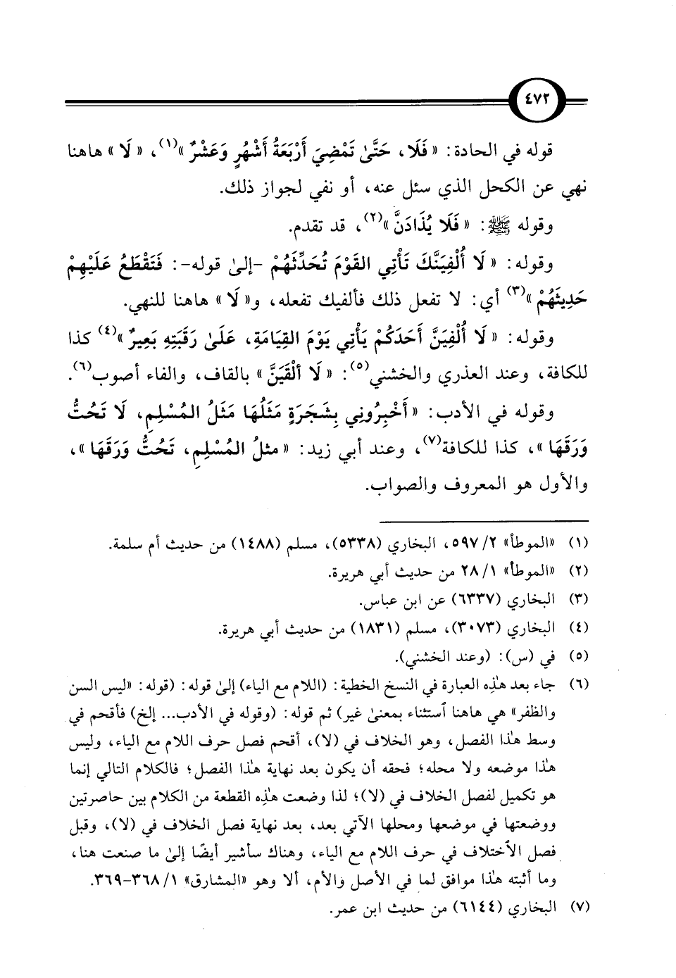 قوله في الحادة: " فَلَا، حَتَّى تَمْضِيَ أَرْبَعَةُ أَشْهُرٍ وَعَشْرٌ " (¬1)، " لَا " هاهنا نهي عن الكحل الذي سئل عنه، أو نفي لجواز ذلك.