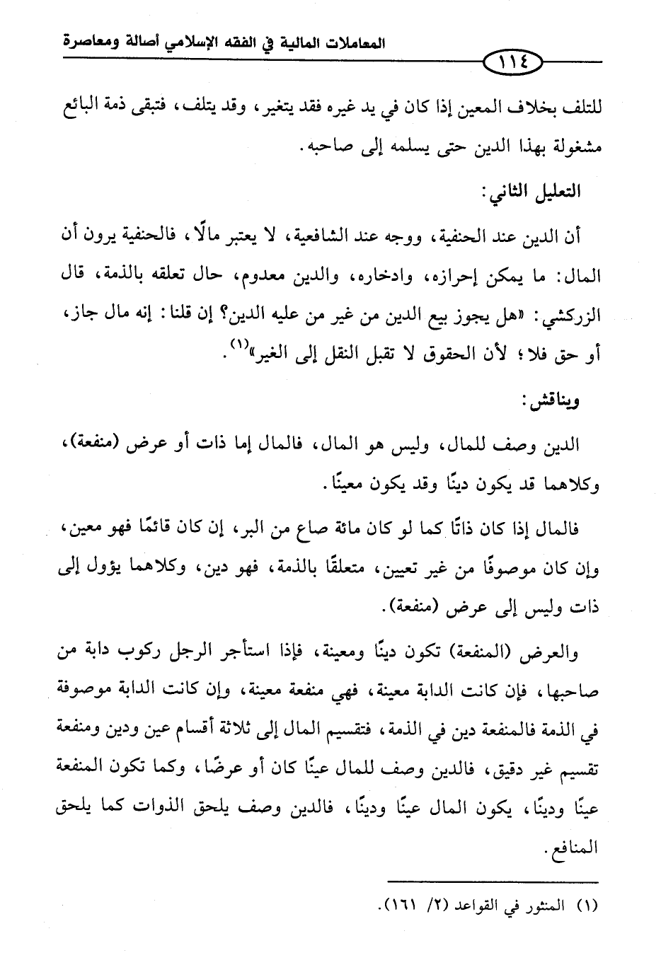 والعرض (المنفعة) تكون دينًا ومعينة، فإذا استأجر الرجل ركوب دابة من صاحبها، فإن كانت الدابة معينة، فهي منفعة معينة، وإن كانت الدابة موصوفة في الذمة فالمنفعة دين في الذمة، فتقسيم المال إلى ثلاثة أقسام عين ودين ومنفعة تقسيم غير دقيق، فالدين وصف للمال عينًا كان أو عرضًا، وكما تكون المنفعة عينًا ودينًا، يكون المال عينًا ودينًا، فالدين وصف يلحق الذوات كما يلحق المنافع.