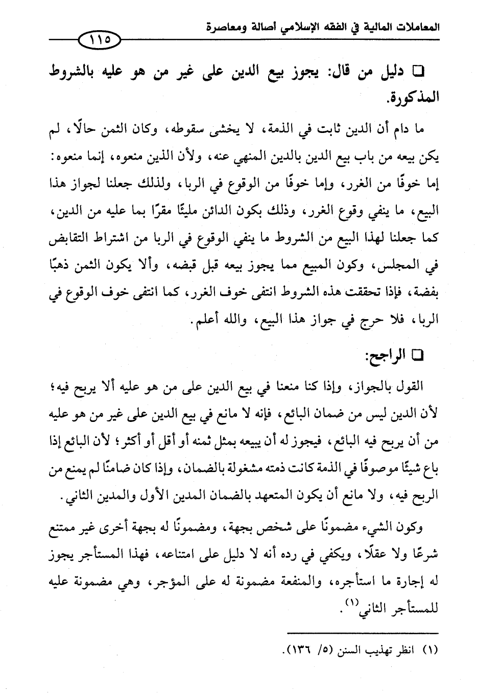القول بالجواز، وإذا كنا منعنا في بيع الدين على من هو عليه ألا يربح فيه؛ لأن الدين ليس من ضمان البائع، فإنه لا مانع في بيع الدين على غير من هو عليه من أن يربح فيه البائع، فيجوز له أن يبيعه بمثل ثمنه أو أقل أو أكثر؛ لأن البائع إذا باع شيئًا موصوفًا في الذمة كانت ذمته مشغولة بالضمان، وإذا كان ضامنا لم يمنع من الربح فيه، ولا مانع أن يكون المتعهد بالضمان المدين الأول والمدين الثاني.