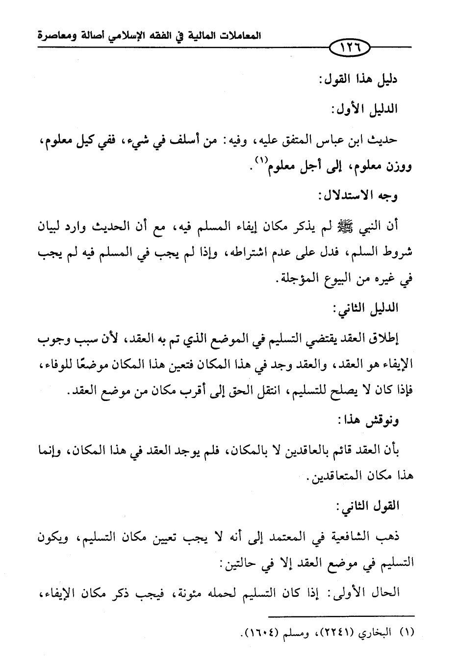 أن النبي - صلى الله عليه وسلم - لم يذكر مكان إيفاء المسلم فيه، مع أن الحديث وارد لبيان شروط السلم، فدل على عدم اشتراطه، وإذا لم يجب في المسلم فيه لم يجب في غيره من البيوع المؤجلة.