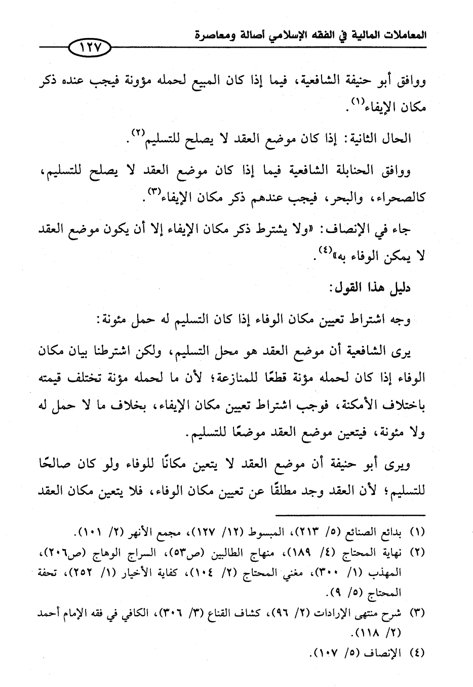 جاء في الإنصاف: "ولا يشترط ذكر مكان الإيفاء إلا أن يكون موضع العقد لا يمكن الوفاء به" (¬٤).