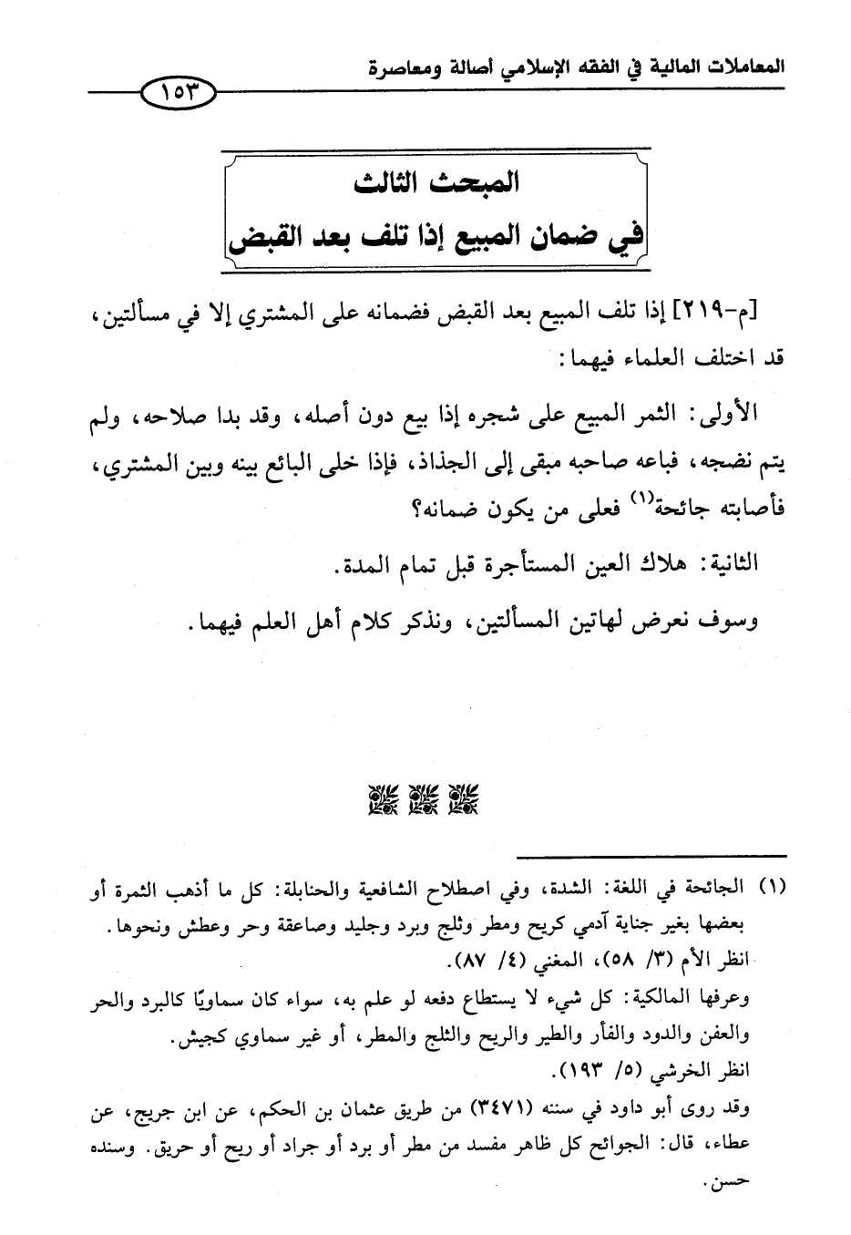 (¬١) الجائحة في اللغة: الشدة، وفي اصطلاح الشافعية والحنابلة: كل ما أذهب الثمرة أو بعضها بغير جناية آدمي كريح ومطر وثلج وبرد وجليد وصاعقة وحر وعطش ونحوها. انظر الأم (٣/ ٥٨)، المغني (٤/ ٨٧).