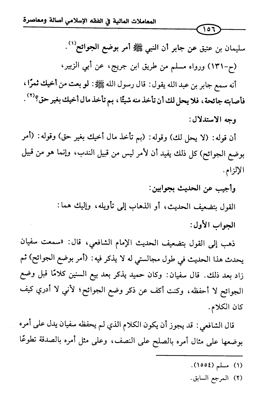 أنه سمع جابر بن عبد الله يقول: قال رسول الله - صلى الله عليه وسلم -: لو بعت من أخيك ثمرًا، فأصابته جائحة، فلا يحل لك أن تأخذ منه شيئًا، بم تأخذ مال أخيك بغير حق؟ (¬٢).
