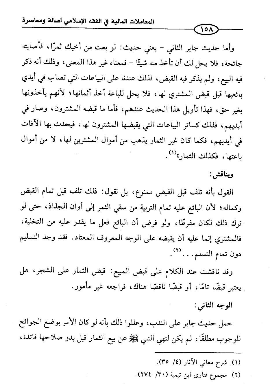 وأما حديث جابر الثاني -يعني حديث: لو بعت من أخيك ثمرًا، فأصابته جائحة، فلا يحل لك أن تأخذ منه شيئًا - فمعناه غير هذا المعنى، وذلك أنه ذكر فيه البيع، ولم يذكر فيه القبض، فذلك عندنا على البياعات التي تصاب في أيدي بائعيها قبل قبض المشتري لها، فلا يحل للباعة أخذ أثمانها؛ لأنهم يأخذونها بغير حق، فهذا تأويل هذا الحديث عندهم، فأما ما قبضه المشترون، وصار في أيديهم، فذلك كسائر البياعات التي يقبضها المشترون لها، فيحدث بها الآفات في أيديهم، فكما كان غير الثمار يذهب من أموال المشترين لها، لا من أموال باعتها، فكذلك الثمار" (¬١).