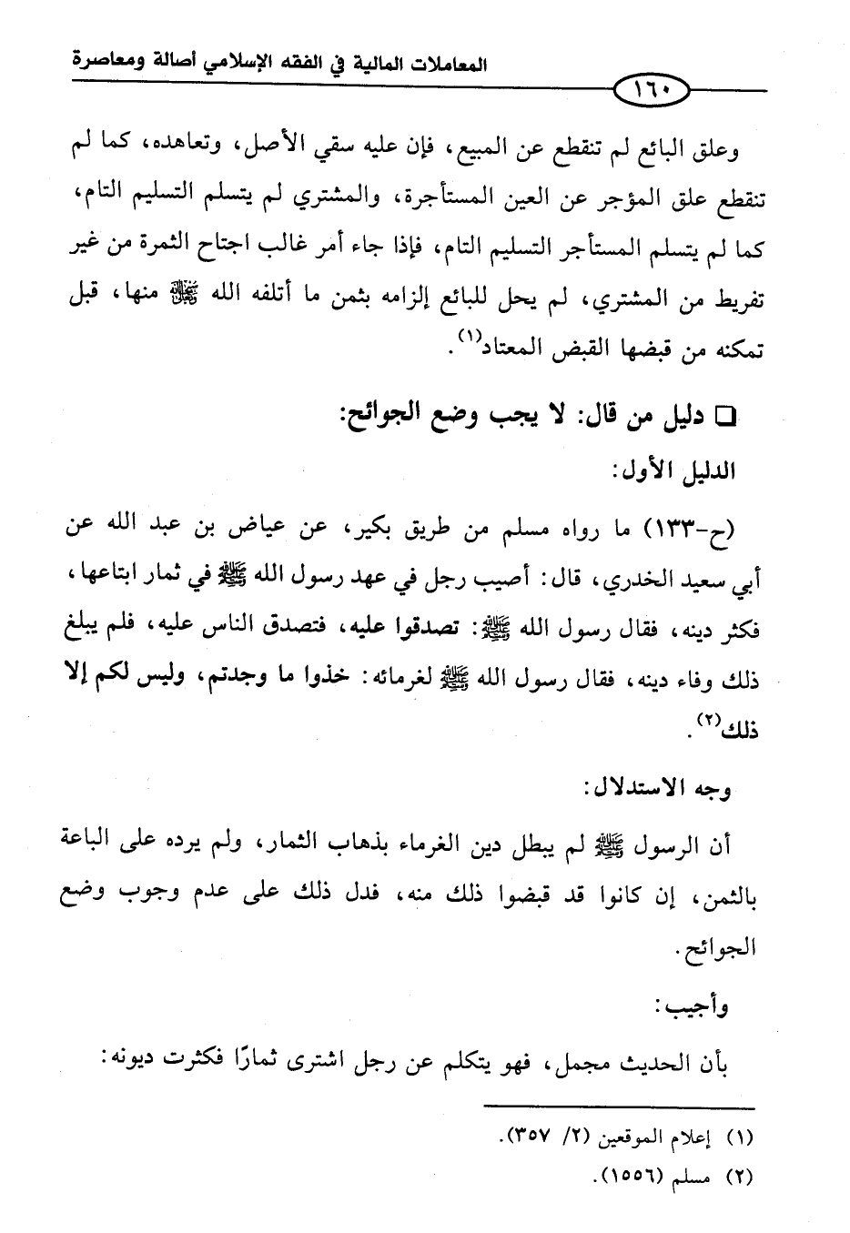 (ح -١٣٣) ما رواه مسلم من طريق بكير، عن عياض بن عبد الله عن أبي سعيد الخدري، قال: أصيب رجل في عهد رسول الله صلى الله عليه وسلم في ثمار ابتاعها، فأكثر دينه، فقال رسول الله - صلى الله عليه وسلم -: تصدقوا عليه، فتصدق الناس عليه، فلم يبلغ ذلك وفاء دينه، فقال رسول الله - صلى الله عليه وسلم - لغرمائه: خذوا ما وجدتم، وليس لكم إلا ذلك (¬٢).