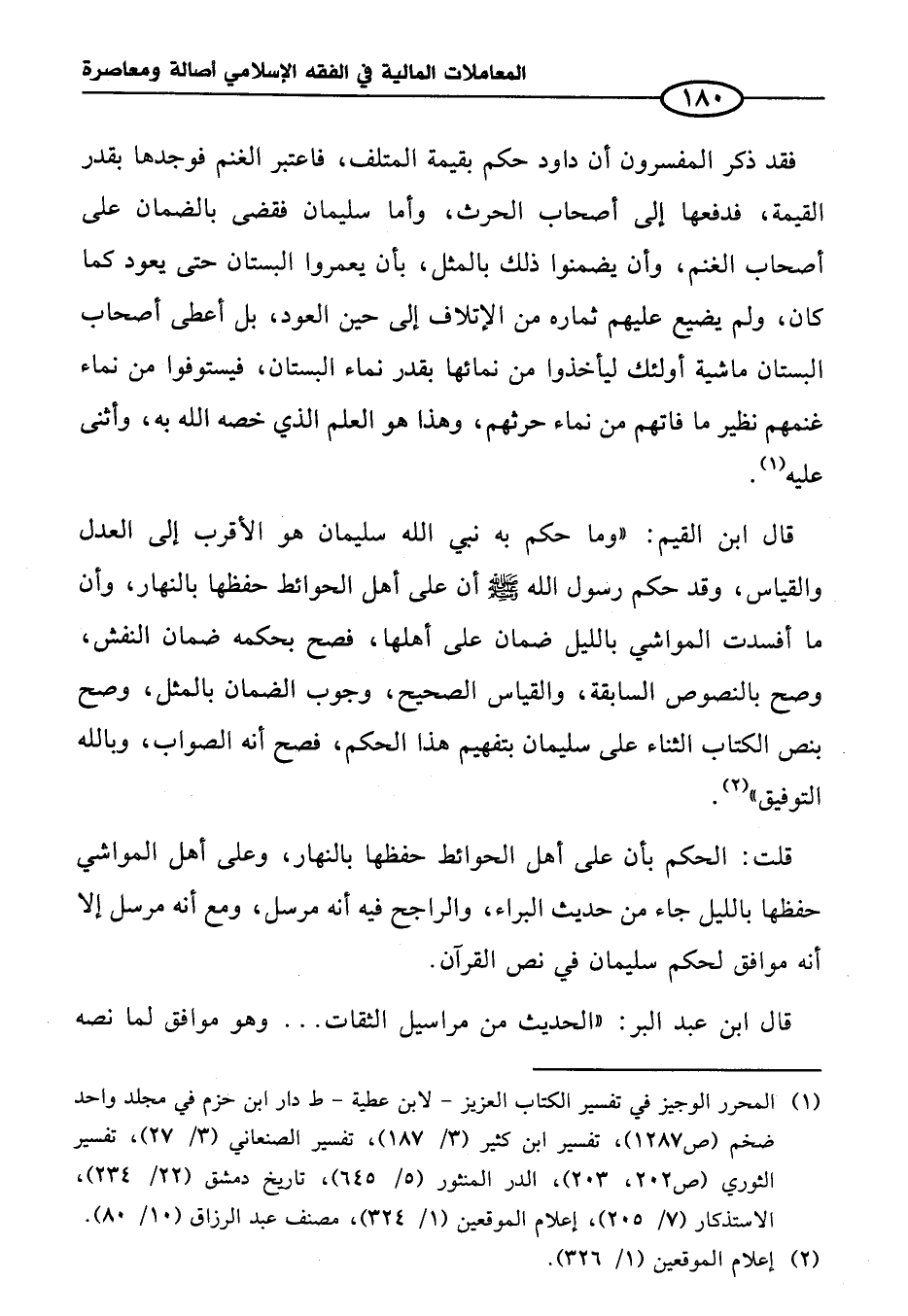 قال ابن القيم: "وما حكم به نبي الله سليمان هو الأقرب إلى العدل والقياس، وقد حكم رسول الله صلى الله عليه وسلم أن على أهل الحوائط حفظها بالنهار، وأن ما أفسدت المواشي بالليل ضمان على أهلها، فصح بحكمه ضمان النفش، وصح بالنصوص السابقة، والقياس الصحيح، وجوب الضمان بالمثل، وصح بنص الكتاب الثناء على سليمان بتفهيم هذا الحكم، فصح أنه الصواب، وبالله التوفيق" (¬٢).