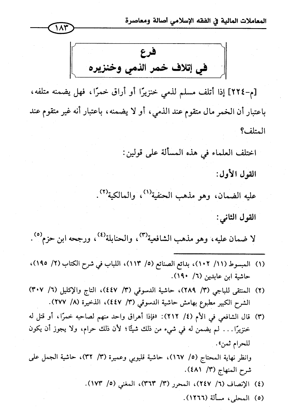 [م - ٢٢٤] إذا أتلف مسلم لذمي خنزيرًا أو أراق خمرًا، فهل يضمنه متلفه، باعتبار أن الخمر مال متقوم عند الذمي، أو لا يضمنه، باعتبار أنه غير متقوم عند المتلف؟