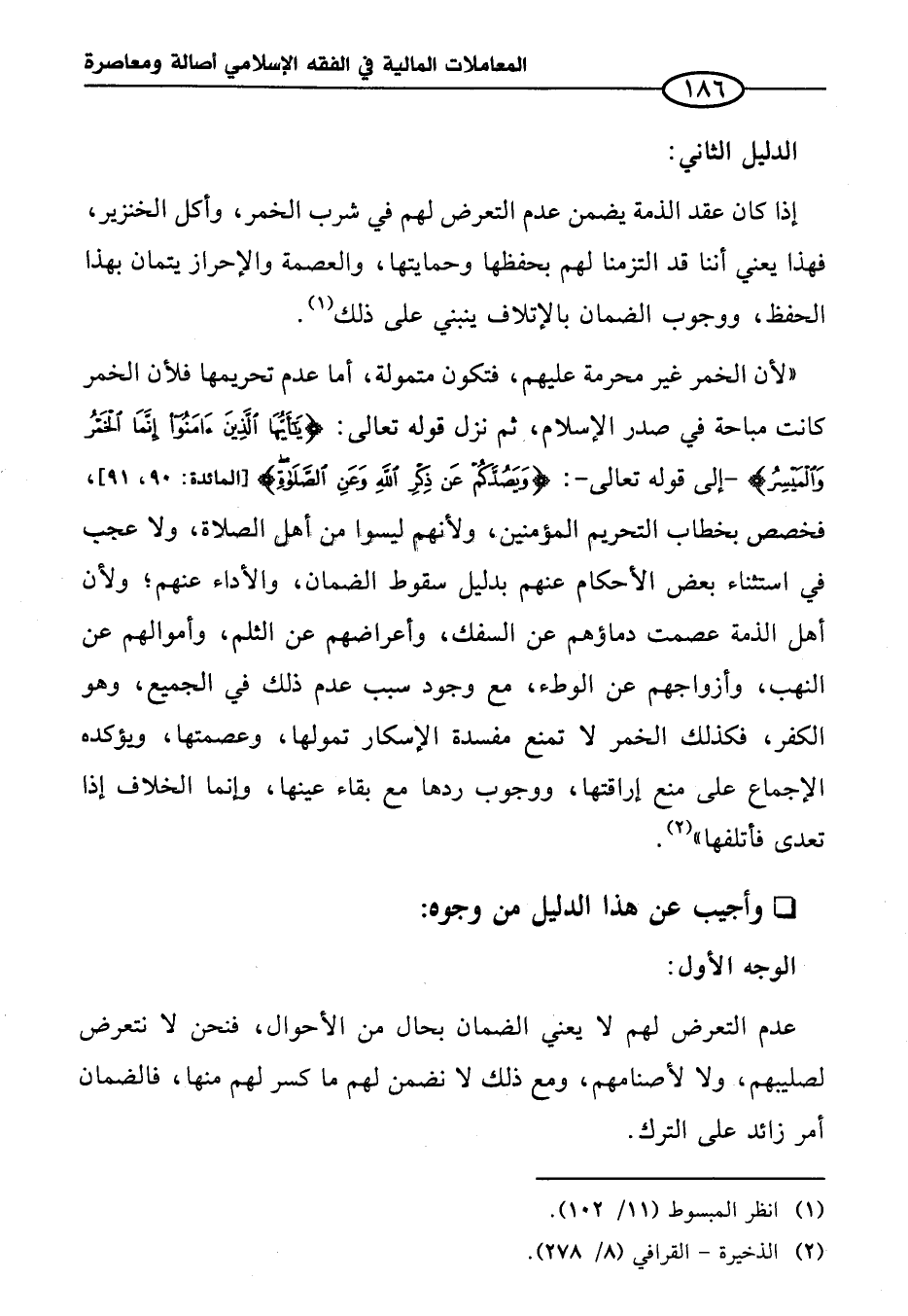 "لأن الخمر غير محرمة عليهم، فتكون متمولة، أما عدم تحريمها فلأن الخمر كانت مباحة في صدر الإِسلام، ثم نزل قوله تعالى: {يَا أَيُّهَا الَّذِينَ آمَنُوا إِنَّمَا الْخَمْرُ وَالْمَيْسِرُ} - إلى قوله تعالى -: {وَيَصُدَّكُمْ عَنْ ذِكْرِ اللَّهِ وَعَنِ الصَّلَاةِ} [المائدة: ٩٠ - ٩١]، فخصص بخطاب التحريم المؤمنين، ولأنهم ليسوا من أهل الصلاة، ولا عجيب في استثناء بعض الأحكام عنهم بدليل سقوط الضمان، والأداء عنهم؛ ولأن أهل الذمة عصمت دماؤهم عن السفك، وأعراضهم عن الثلم، وأموالهم عن النهب، وأزواجهم عن الوطء، مع وجود سبب عدم ذلك في الجميع، وهو الكفر، فكذلك الخمر لا تمنع مفسدة الإسكار تمولها، وعصمتها، ويؤكده الإجماع على منع إراقتها، ووجوب ردها مع بقاء عينها، وإنما الخلاف إذا تعدى فأتلفها" (¬٢).