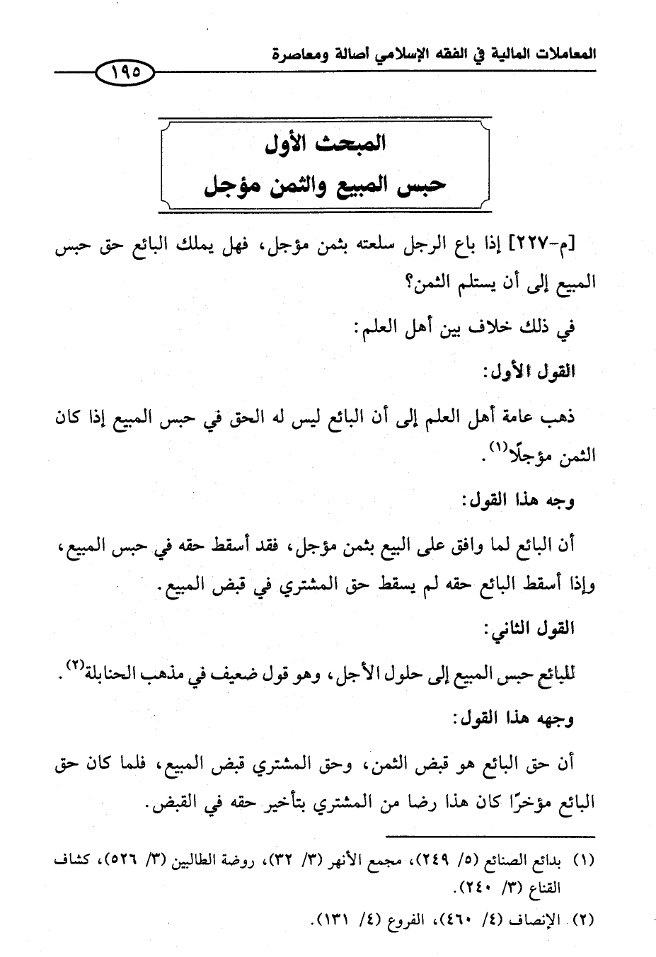 المبحث الأولى حبس المبيع والثمن مؤجل