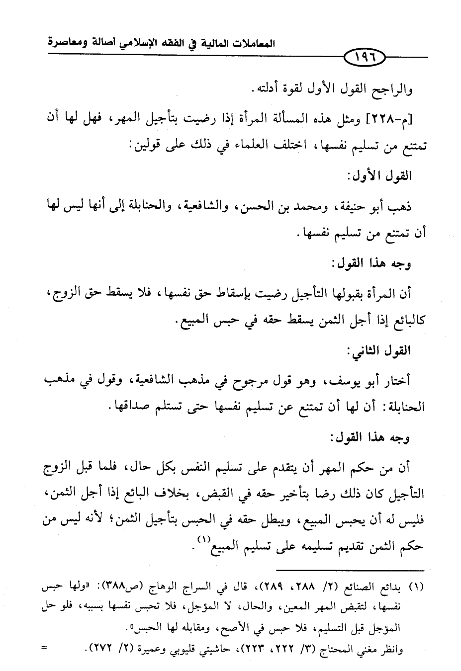 (¬١) بدائع الصنائع (٢/ ٢٨٨، ٢٨٩)، قال في السراج الوهاج (ص ٣٨٨): "ولها حبس نفسها، لتقبض المهر المعين، والحال، لا المؤجل، فلا تحبس نفسها بسببه، فلو حل المؤجل قبل التسليم، فلا حبس في الأصح، ومقابله لها الحبس".