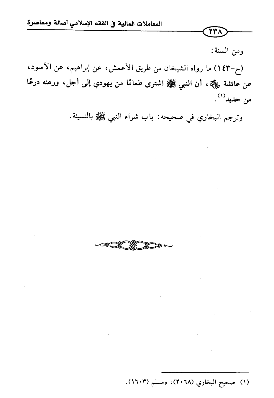 (ح -١٤٣) ما رواه الشيخان من طريق الأعمش، عن إبراهيم، عن الأسود، عن عائشة - رضي الله عنهما -، أن النبي - صلى الله عليه وسلم - اشترى طعامًا من يهودي إلى أجل، ورهنه درعًا من حديد (¬١).