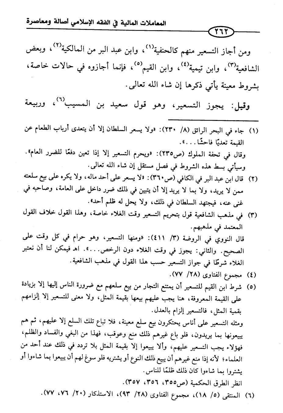 (¬٥) شرط ابن القيم للتسعير أن يمتنع التجار من بيع سلعهم مع ضرورة الناس إليها إلا بزيادة على القيمة المعروفة، هنا يجب عليهم بيعها بقيمة المثل، ولا معنى للتسعير إلا إلزامهم بقمية المثل، فالتسعير إلزام بالعدل.