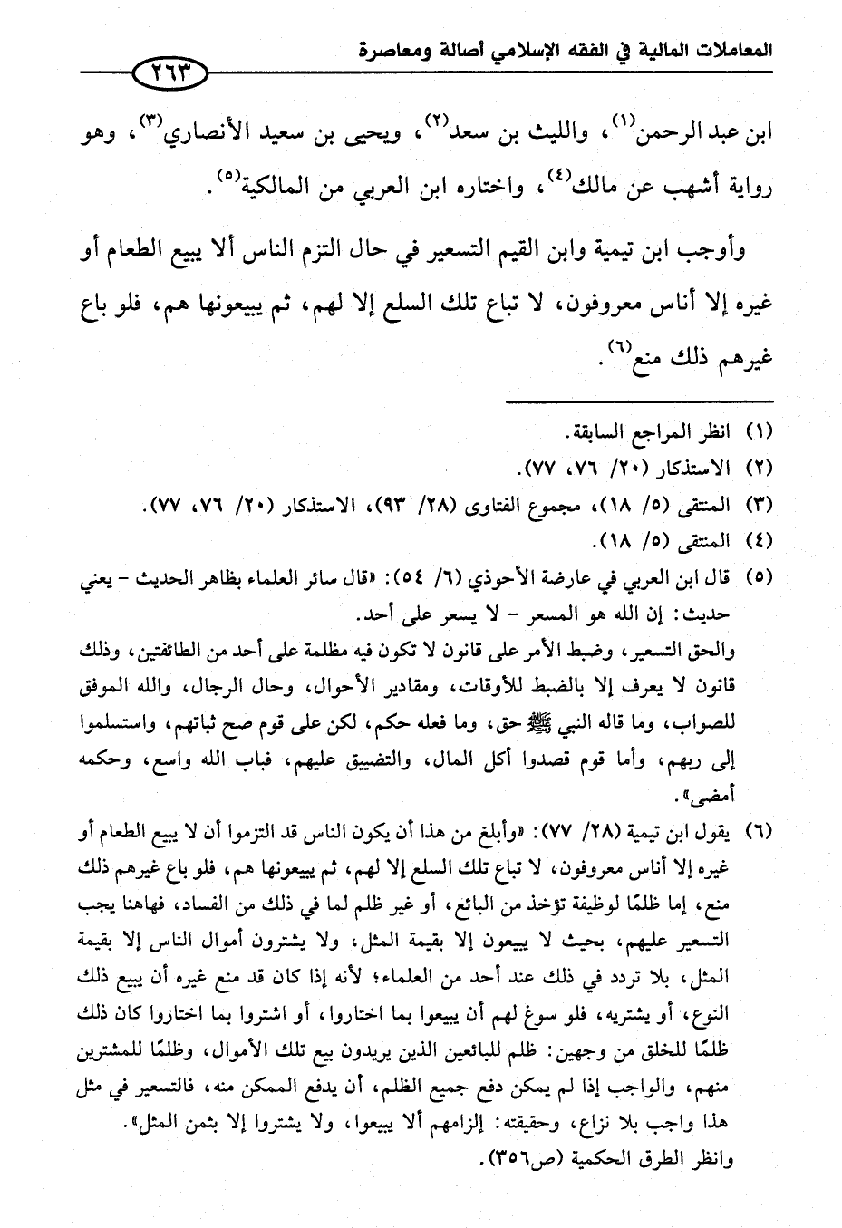 (¬٦) يقول ابن تيمية (٢٨/ ٧٧): "وأبلغ من هذا أن يكون الناس قد التزموا أن لا يبيع الطعام أو غيره إلا أناس معروفون، لا تباع تلك السلع إلا لهم، ثم يبيعونها هم، فلو باع غيرهم ذلك منع، إما ظلمًا لوظيفة تؤخذ من البائع، أو غير ظلم لما في ذلك من الفساد، فهاهنا يجب التسعير عليهم، بحيث لا يبيعون إلا بقيمة المثل، ولا يشترون أموال الناس إلا بقيمة المثل، بلا تردد في ذلك عند أحد من العلماء؛ لأنه إذا كان قد منع غيره أن يبيع ذلك النوع، أو يشتريه، فلو سوغ لهم أن يبيعوا بما اختاروا، أو اشتروا بما اختاروا كان ذلك ظلمًا للخلق من وجهين: ظلم للبائعين الذين يريدون بيع تلك الأموال، وظلمًا للمشترين منهم، والواجب إذا لم يمكن دفع جميع الظلم، أن يدفع الممكن منه، فالتسعير في مثل هذا واجب بلا نزاع، وحقيقته: إلزامهم ألا يبيعوا، ولا يشتروا إلا بثمن المثل".