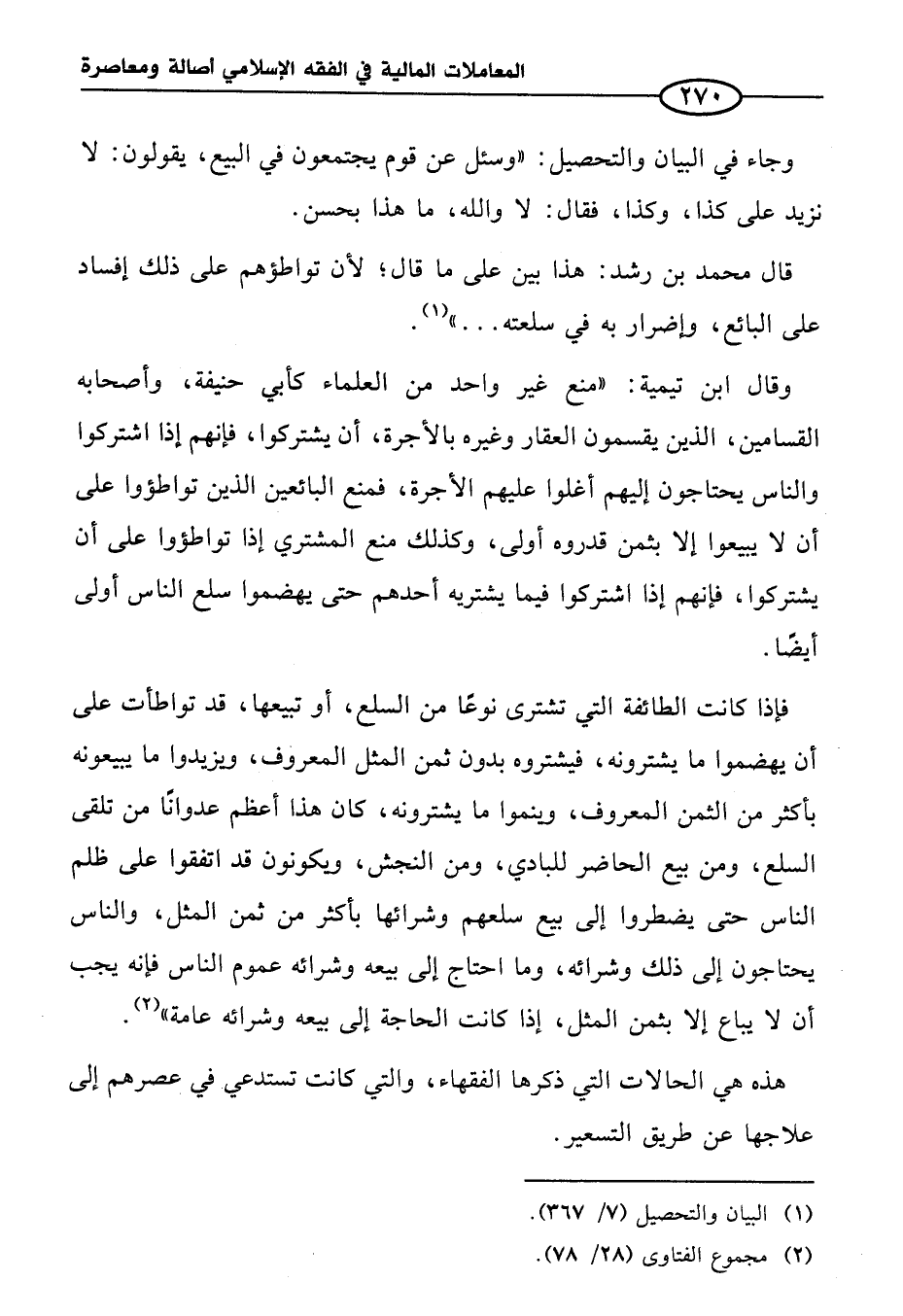 فإذا كانت الطائفة التي تشترى نوعًا من السلع، أو تبيعها، قد تواطأت على أن يهضموا ما يشترونه، فيشتروه بدون ثمن المثل المعروف، ويزيدوا ما يبيعونه بأكثر من الثمن المعروف، وينموا ما يشترونه، كان هذا أعظم عدوانًا من تلقى السلع، ومن بيع الحاضر للبادي، ومن النجش، ويكونون قد اتفقوا على ظلم الناس حتى يضطروا إلى بيع سلعهم وشرائها بأكثر من ثمن المثل، والناس يحتاجون إلى ذلك وشرائه، وما احتاج إلى بيعه وشرائه عموم الناس فإنه يجب أن لا يباع إلا بثمن المثل، إذا كانت الحاجة إلى بيعه وشرائه عامة" (¬٢).