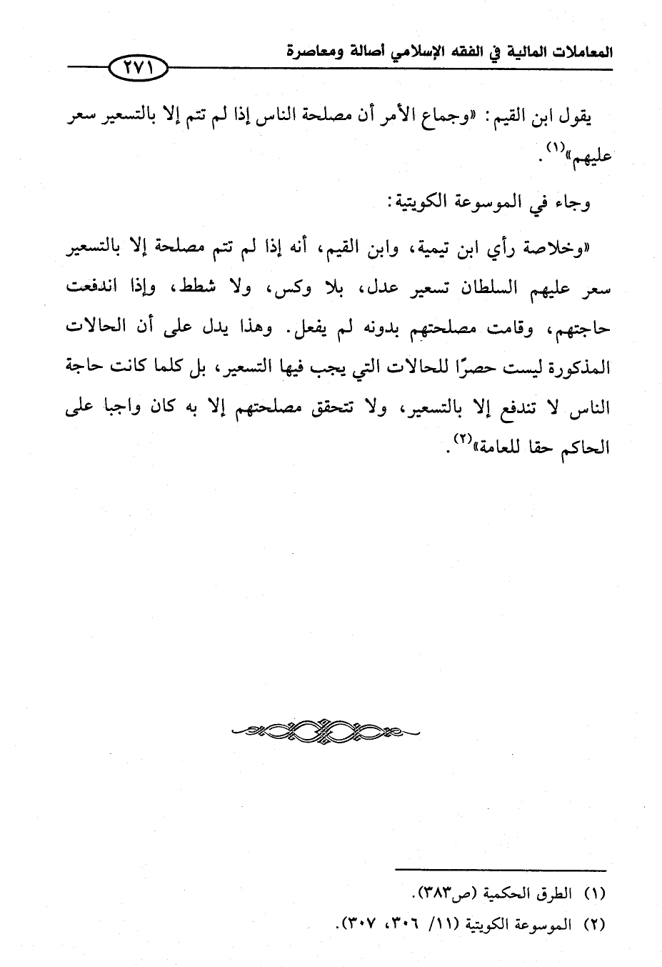 "وخلاصة رأي ابن تيمية، وابن القيم، أنه إذا لم تتم مصلحة إلا بالتسعير سعر عليهم السلطان تسعير عدل، بلا وكس، ولا شطط، وإذا اندفعت حاجتهم، وقامت مصلحتهم بدونه لم يفعل. وهذا يدل على أن الحالات المذكورة ليست حصرًا للحالات التي يجب فيها التسعير، بل كلما كانت حاجة الناس لا تندفع إلا بالتسعير، ولا تتحقق مصلحتهم إلا به كان واجبا على الحاكم حقا للعامة" (¬٢).