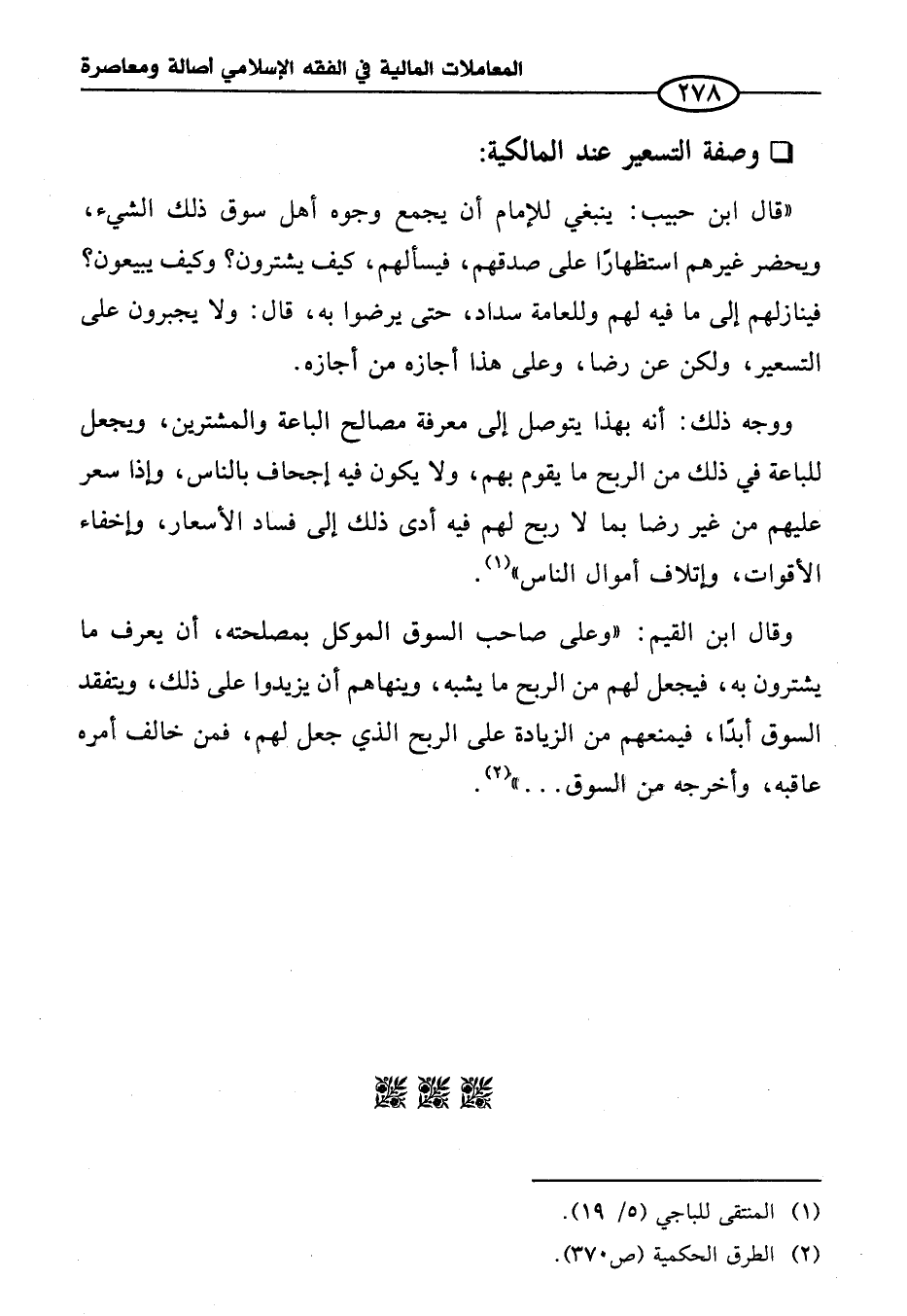 وقال ابن القيم: "وعلى صاحب السوق الموكل بمصلحته، أن يعرف ما يشترون به، فيجعل لهم من الربح ما يشبه، وينهاهم أن يزيدوا على ذلك، ويتفقد السوق أبداً، فيمنعهم من الزيادة على الربح الذي جعل لهم، فمن خالف أمره عاقبه، وأخرجه عن السوق ... " (¬٢).