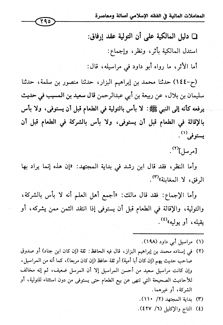 (¬٢) في إسناده محمد بن إبراهيم البزاز، قال فيه الحافظ: ثقة (إن كان ابن جناد) أو صدوق صاحب حديث يهم (إن كان أبا أمية) أو ثقة حافظ (إن كان مربعا)، كما أنه من المراسيل، وإن كانت مراسيل سعيد من أحسن المراسيل إلا أن المرسل ضعيف، ثم إنه مخالف للأحاديث الصحيحة التي تنهى عن بيع الطعام حتى يستوفى من دون استثناء للتولية، أو الشركة، أو غيرهما.