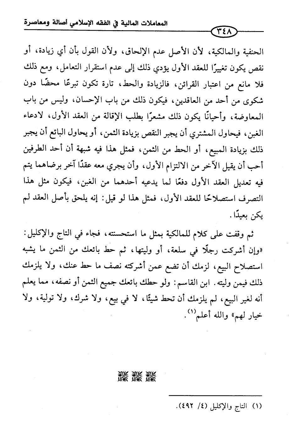 الحنفية والمالكية، لأن الأصل عدم الإلحاق، ولأن القول بأن أي زيادة، أو نقص يكون تغييرًا للعقد الأول يؤدي ذلك إلى عدم استقرار التعامل، ومع ذلك فلا مانع من اعتبار القرائن، فالزيادة والحط، تارة تكون تبرعًا محضًا دون شكوى من أحد من العاقدين، فيكون ذلك من باب الإحسان، وليس من باب المعاوضة، وأحيانًا يكون ذلك مشعرًا بطلب الإقالة من العقد الأول، لادعاء الغبن، فيحاول المشتري أن يجبر النقص بزيادة الثمن، أو يحاول البائع أن يجبر ذلك بزيادة المبيع، أو الحط من الثمن، فمثل هذا فيه شبهة أن أحد الطرفين أحب أن يقيل الآخر من الالتزام الأول، وأن يجري معه عقدًا آخر برضاهما يتم فيه تعديل العقد الأول دفعًا لما يدعيه أحدهما من الغبن، فيكون مثل هذا التصرف استصلاحًا للعقد الأول، فمثل هذا لو قيل: إنه يلحق بأصل العقد لم يكن بعيدًا.