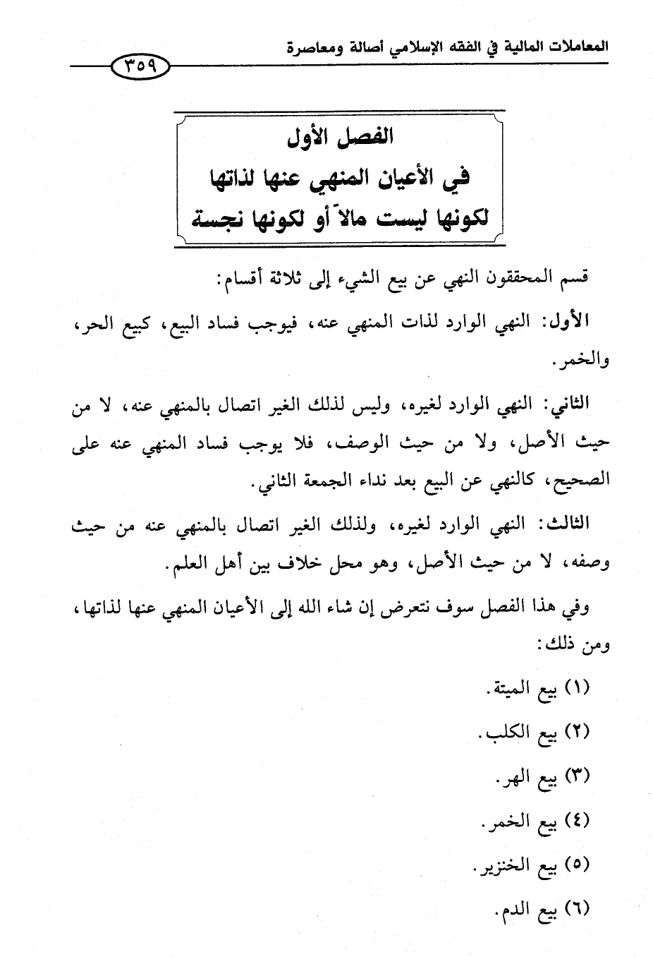 الفصل الأول في الأعيان المنهي عنها لذاتها لكونها ليست مالاً أو لكونها نجسة