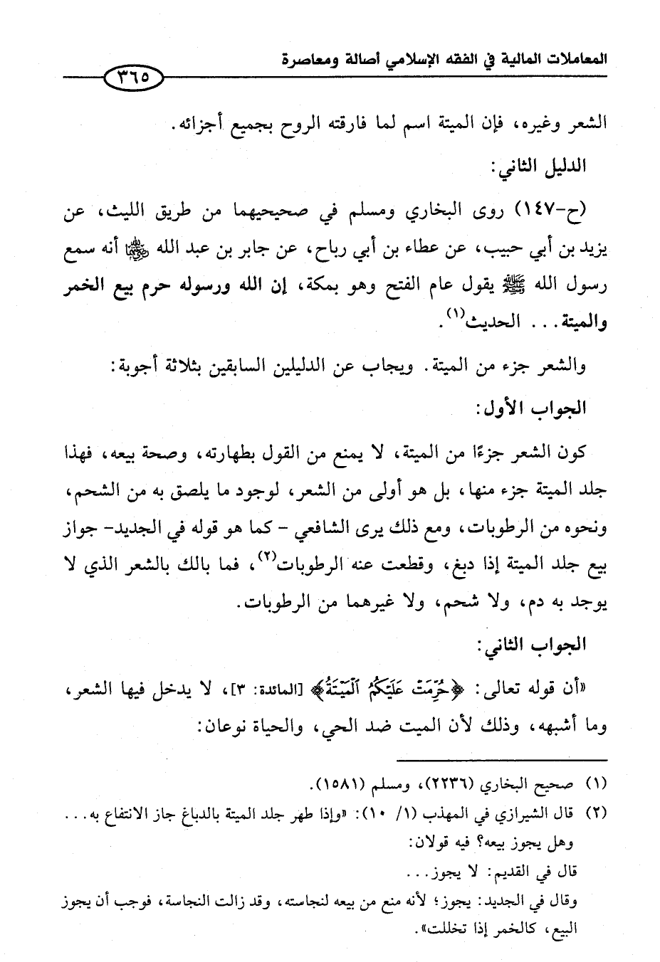 والشعر جزء من الميتة. ويجاب عن الدليلين السابقين بثلاثة أجوبة: