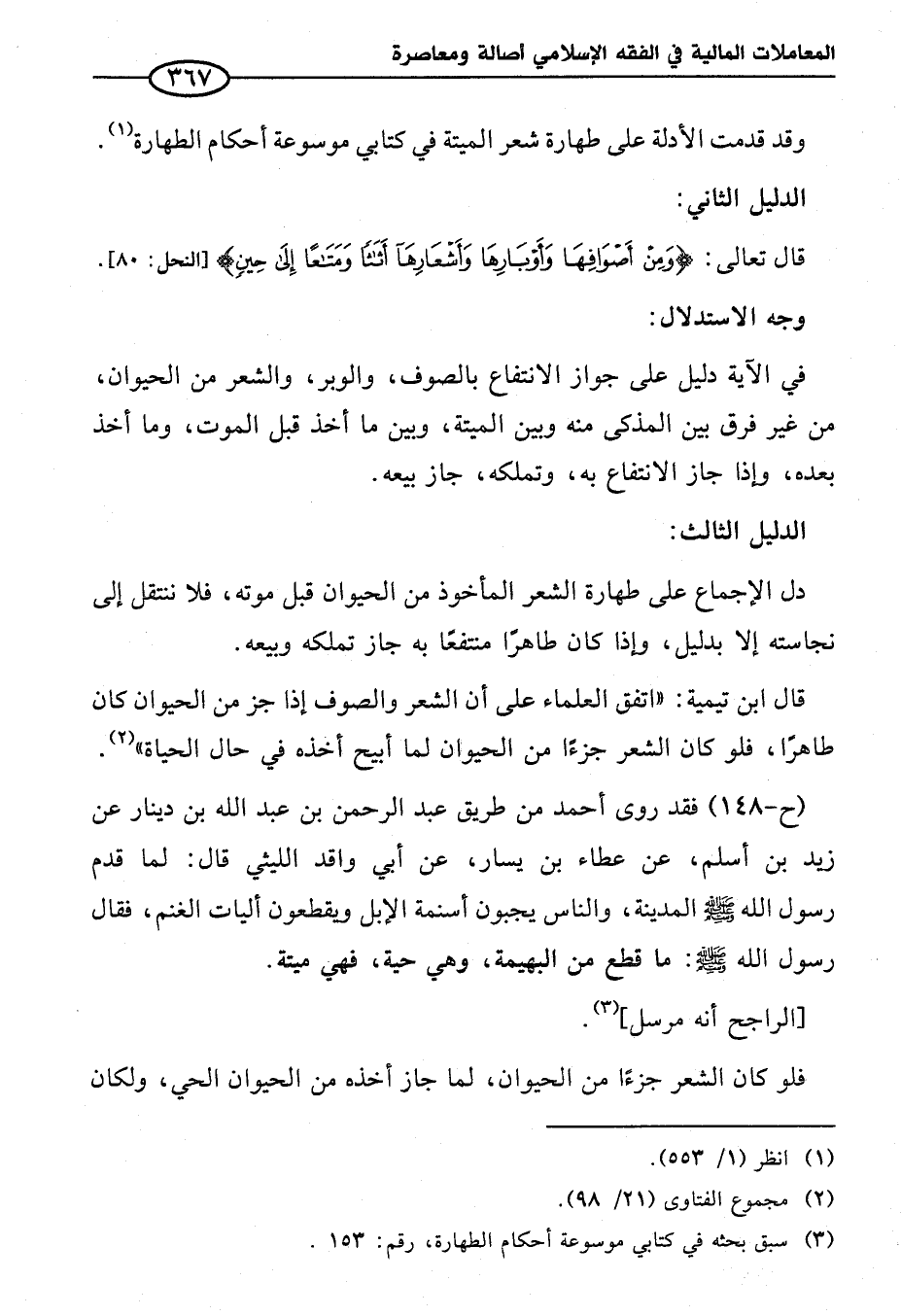 قال ابن تيمية: "اتفق العلماء على أن الشعر والصوف إذا جز من الحيوان كان طاهرًا، فلو كان الشعر جزءًا من الحيوان لما أبيح أخذه في حال الحياة" (¬٢).