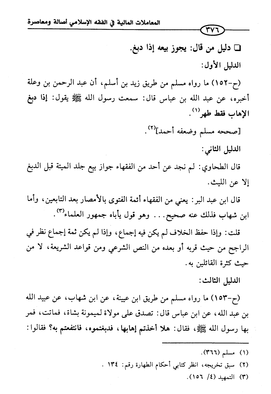 (ح-١٥٣) ما رواه مسلم من طريق ابن عيينة، عن ابن شهاب، عن عبيد الله بن عبد الله، عن ابن عباس قال: تصدق على مولاة لميمونة بشاة، فماتت، فمر بها رسول الله - صلى الله عليه وسلم -، فقال: هلا أخذتم إهابها، فدبغتموه، فانتفعتم به؟ فقالوا: