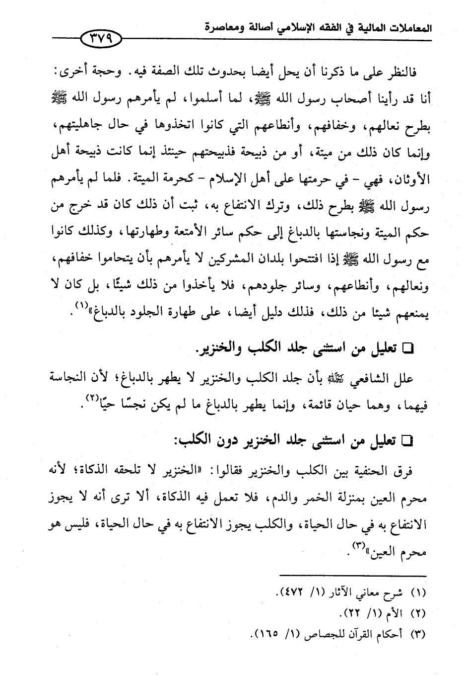 فالنظر على ما ذكرنا أن يحل أيضا بحدوث تلك الصفة فيه. وحجة أخرى: أنا قد رأينا أصحاب رسول الله - صلى الله عليه وسلم -، لما أسلموا، لم يأمرهم رسول الله - صلى الله عليه وسلم - بطرح نعالهم، وخفافهم، وأنطاعهم التي كانوا اتخذوها في حال جاهليتهم، وإنما كان ذلك من ميتة، أو من ذبيحة فذبيحتهم حينئذ إنما كانت ذبيحة أهل الأوثان، فهي -في حرمتها على أهل الإسلام- كحرمة الميتة. فلما لم يأمرهم رسول الله - صلى الله عليه وسلم - بطرح ذلك، وترك الانتفاع به، ثبت أن ذلك كان قد خرج من حكم الميتة ونجاستها بالدباغ إلى حكم سائر الأمتعة وطهارتها، وكذلك كانوا مع رسول الله - صلى الله عليه وسلم - إذا افتتحوا بلدان المشركين لا يأمرهم بأن يتحاموا خفافهم، ونعالهم، وأنطاعهم، وسائر جلودهم، فلا يأخذوا من ذلك شيئًا، بل كان لا يمنعهم شيئا من ذلك، فذلك دليل أيضا، على طهارة الجلود بالدباغ" (¬١).
