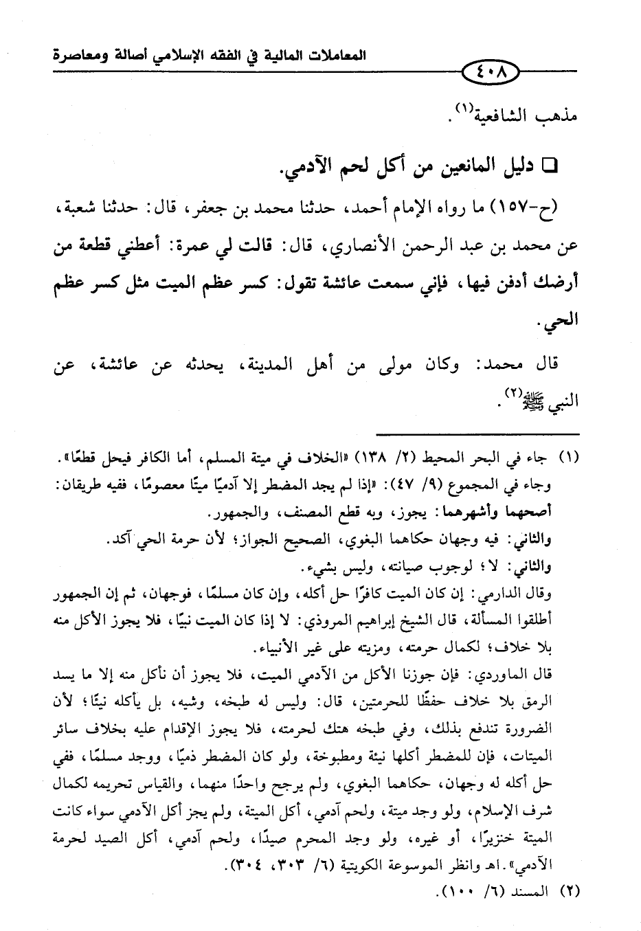 (ح-١٥٧) ما رواه الإمام أحمد، حدثنا محمد بن جعفر، قال: حدثنا شعبة، عن محمد بن عبد الرحمن الأنصاري، قال: قالت لي عمرة: أعطني قطعة من أرضك أدفن فيها، فإني سمعت عائشة تقول: كسر عظم الميت مثل كسر عظم الحي.