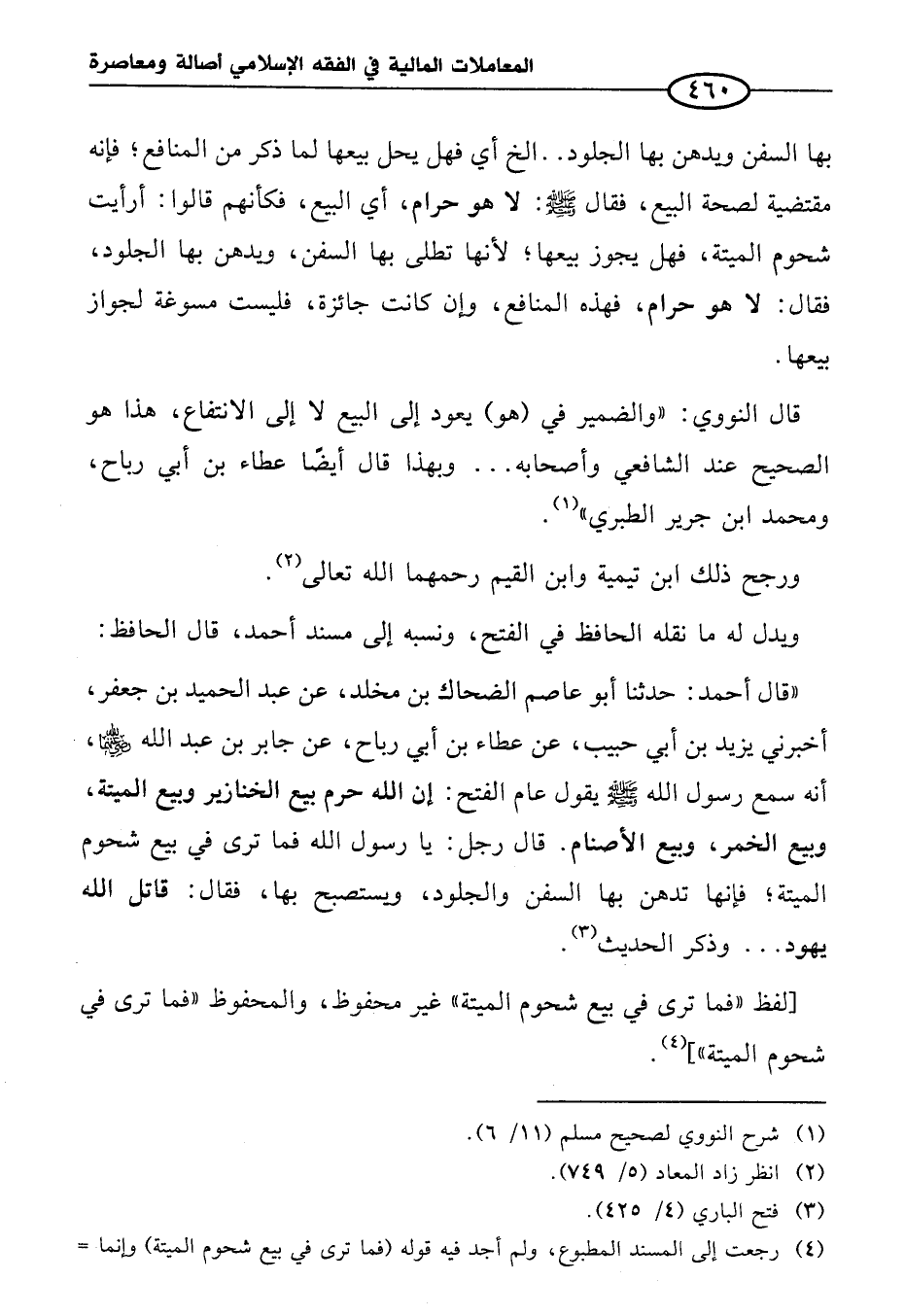 "قال أحمد: حدثنا أبو عاصم الضحاك بن مخلد، عن عبد الحميد بن جعفر، أخبرني يزيد بن أبي حبيب، عن عطاء بن أبي رباح، عن جابر بن عبد الله - رضي الله عنهما -، أنه سمع رسول الله - صلى الله عليه وسلم - يقول عام الفتح: إن الله حرم بيع الخنازير وبيع الميتة، وبيع الخمر، وبيع الأصنام. قال رجل: يا رسول الله فما ترى في بيع شحوم الميتة؛ فإنها تدهن بها السفن والجلود، ويستصبح بها، فقال: قاتل الله يهود ... وذكر الحديث (¬٣).