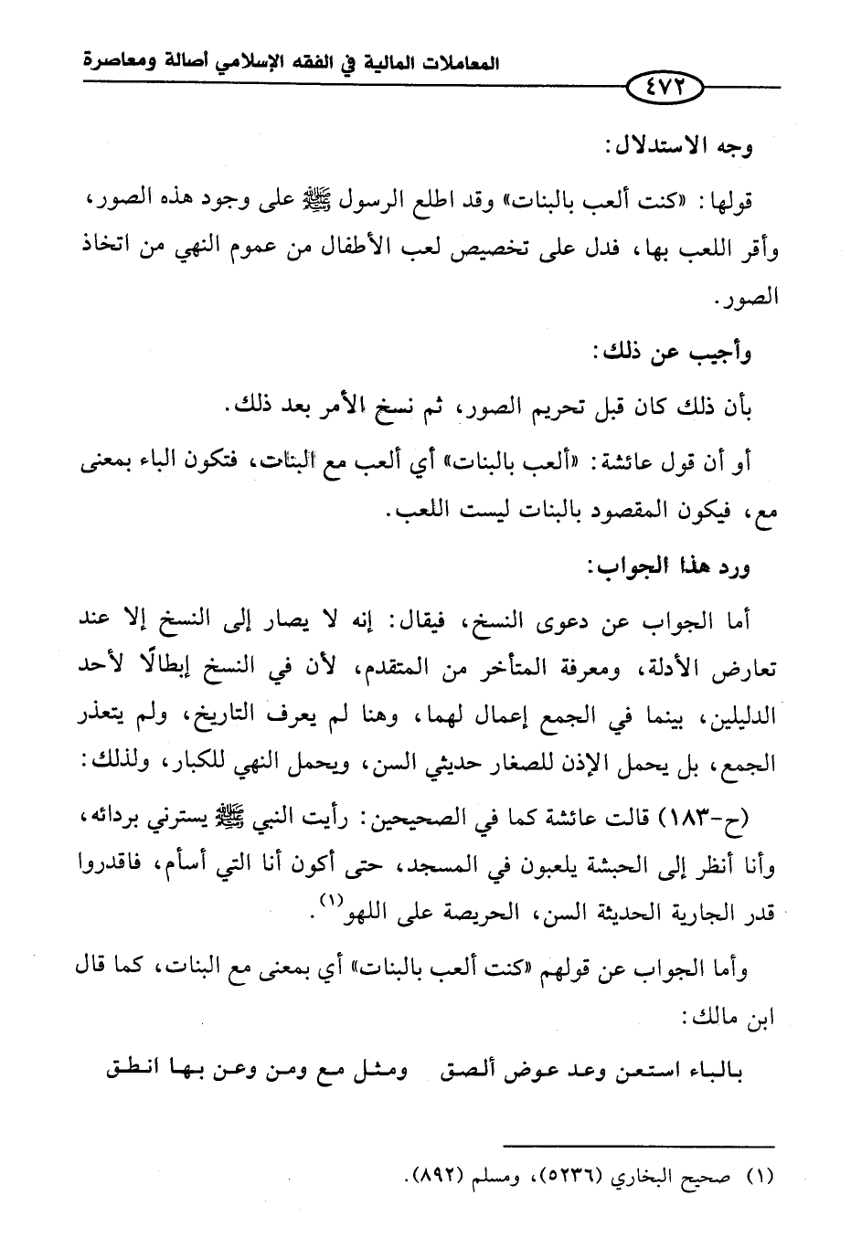 أما الجواب عن دعوى النسخ، فيقال: إنه لا يصار إلى النسخ إلا عند تعارض الأدلة، ومعرفة المتأخر من المتقدم، لأن في النسخ إبطالًا لأحد الدليلين، بينما في الجمع إعمال لهما، وهنا لم يعرف التاريخ، ولم يتعذر الجمع، بل يحمل الإذن للصغار حديثي السن، ويحمل النهي للكبار، ولذلك: (ح-١٨٣) قالت عائشة كما في الصحيحين: رأيت النبي - صلى الله عليه وسلم - يسترني بردائه، وأنا انظر إلى الحبشة يلعبون في المسجد، حتى أكون أنا التي أسأم، فاقدروا قدر الجارية الحديثة السن، الحريصة على اللهو (¬١).