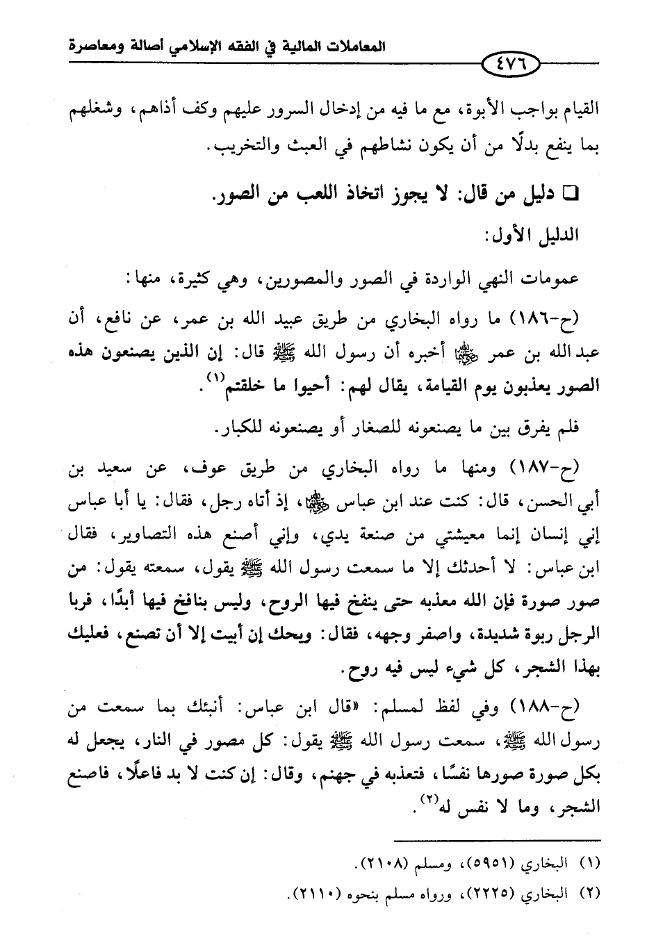 (ح - ١٨٧) ومنها ما رواه البخاري من طريق عوف، عن سعيد بن أبي الحسن، قال: كنت عند ابن عباس - رضي الله عنهما -، إذ أتاه رجل، فقال: يا أبا عباس إني إنسان إنما معيشتي من صنعة يدي، وإني أصنع هذه التصاوير، فقال ابن عباس: لا أحدثك إلا ما سمعت رسول الله - صلى الله عليه وسلم - يقول، سمعته يقول: من صور صورة فإن الله معذبه حتى ينفخ فيها الروح، وليس بنافخ فيها أبدًا، فربا الرجل ربوة شديدة، واصفر وجهه، فقال: ويحك إن أبيت إلا أن تصنع، فعليك بهذا الشجر، كل شيء ليس فيه روح.