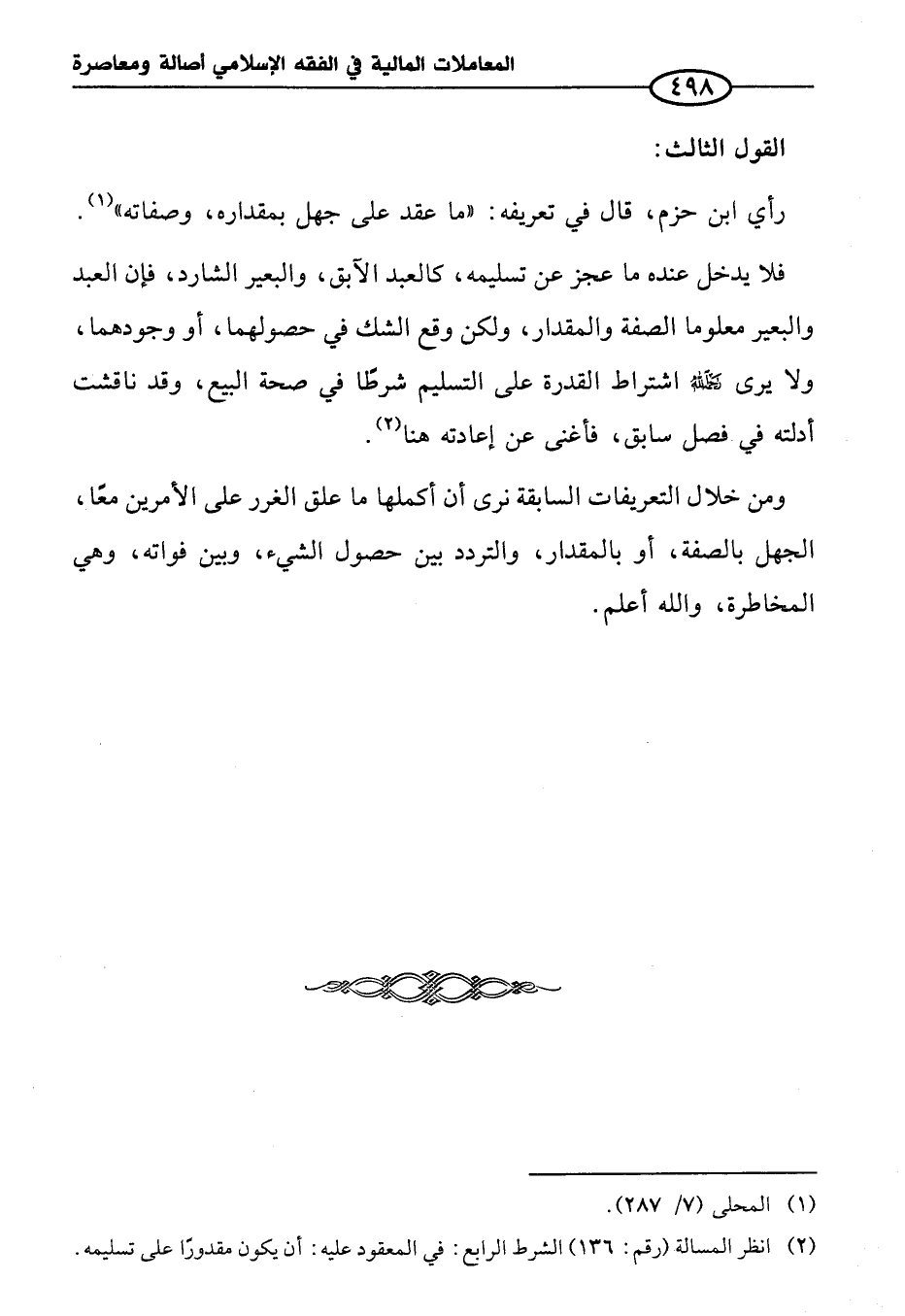 (¬٢) انظر المسألة (رقم: ١٣٦) الشرط الرابع: في المعقود عليه: أن يكون مقدورًا على تسليمه.