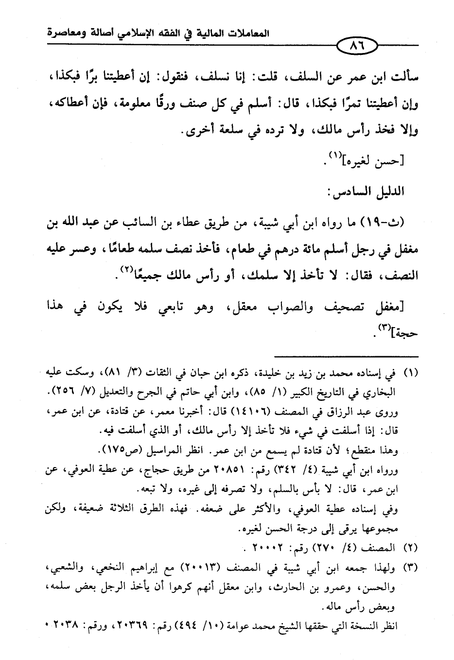 (¬٣) ولهذا جمعه ابن أبي شيبة في المصنف (٢٠٠١٣) مع إبراهيم النخعي، والشعبي، والحسن، وعمرو بن الحارث، وابن معقل أنهم كرهوا أن يأخذ الرجل بعض سلمه، وبعض رأس ماله.