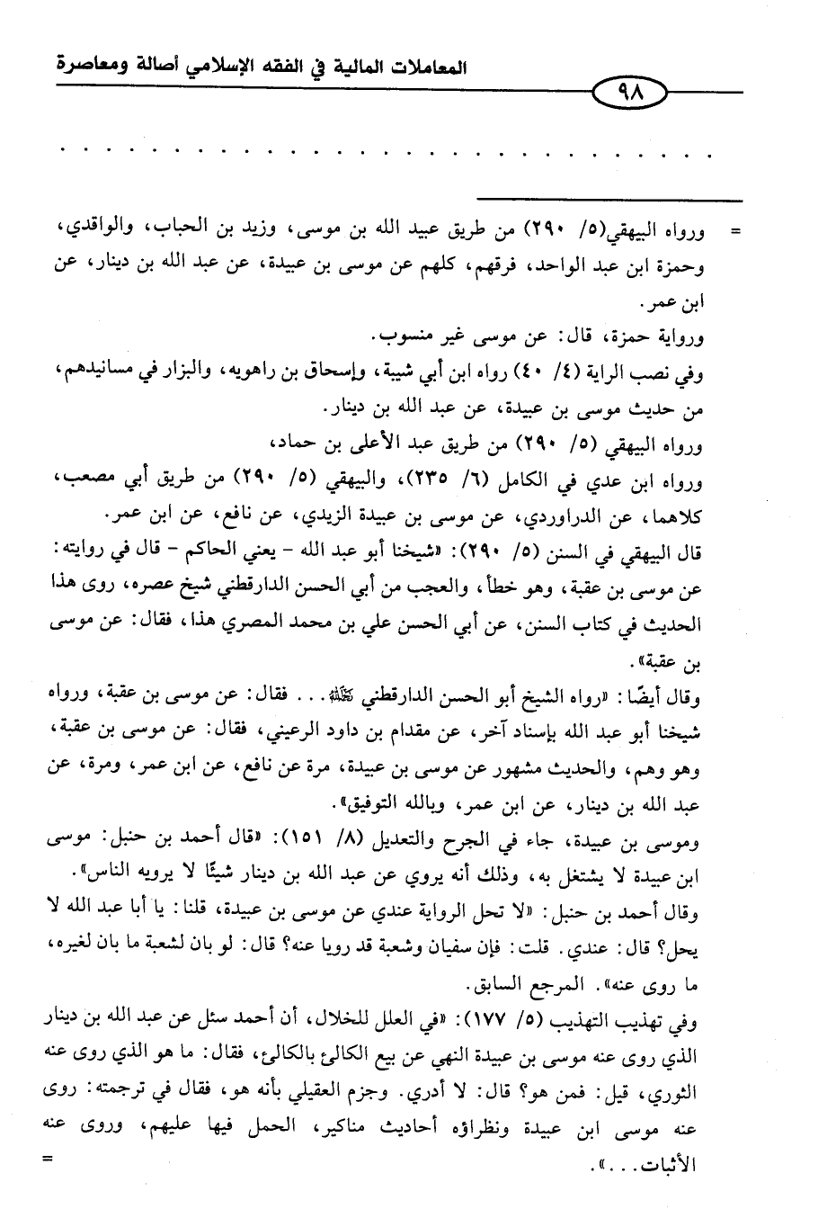 وموسى بن عبيدة، جاء في الجرح والتعديل (٨/ ١٥١): "قال أحمد بن حنبل: موسى ابن عبيدة لا يشتغل به، وذلك أنه يروي عن عبد الله بن دينار شيئًا لا يرويه الناس".