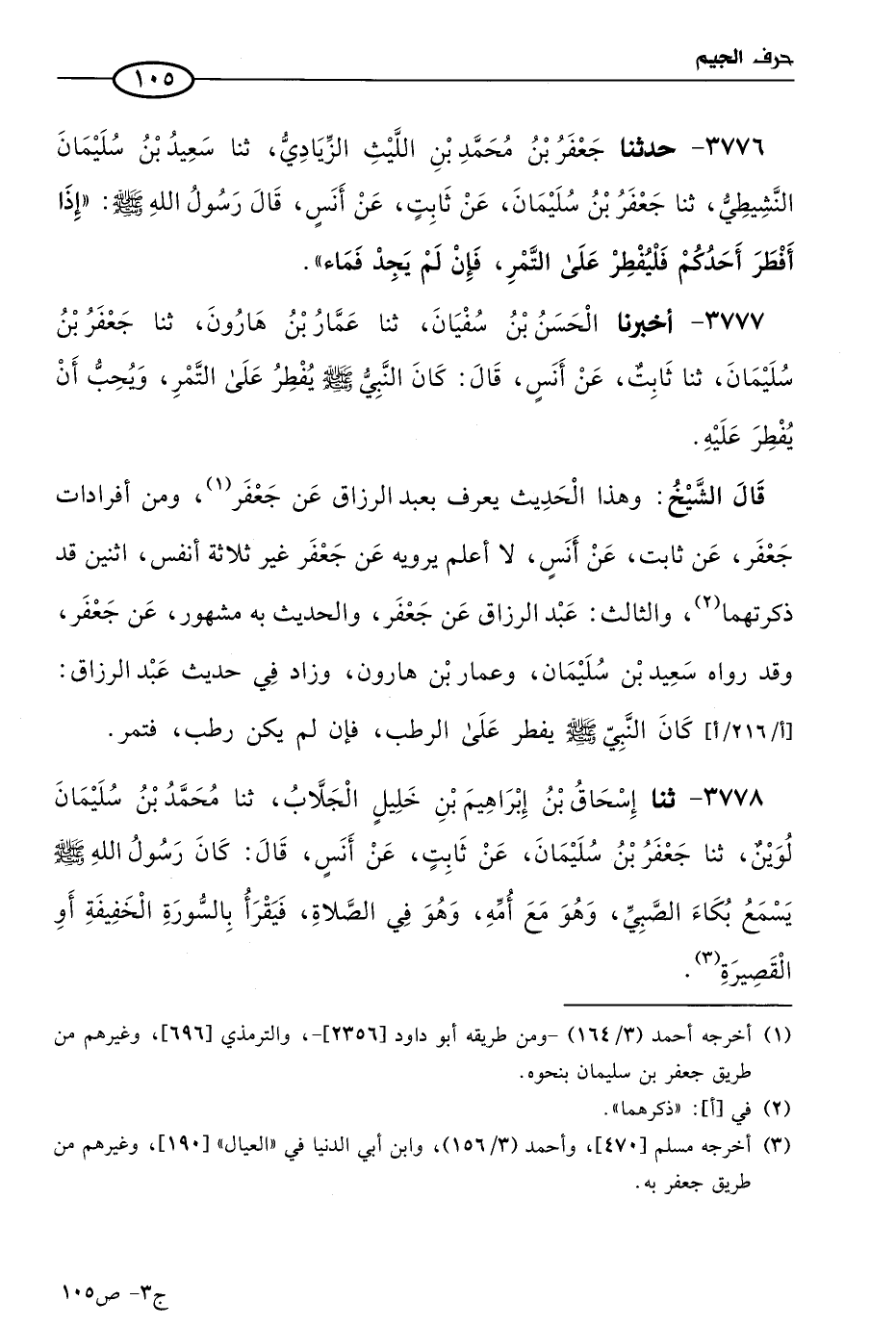 قال الشيخ: وهذا الحديث يُعرَف بعبد الرَّزَّاق عن جعفر، ومن أفرادات جعفر عن ثابت عن أنس، لا أعلم يرويه عن جعفر غير ثلاثة أنفس، اثنين قد ذكرتهما، والثالث عَبد الرَّزَّاق عن جعفر، والحديث به مشهور عن جعفر، وقد رواه سعيد بن سليمان وعمار بن هارون، وزاد في حديث عَبد الرَّزَّاق: كان النبي صَلى الله عَليه وسَلم يفطر على الرطب، فإن لم يكن رطب فتمر.