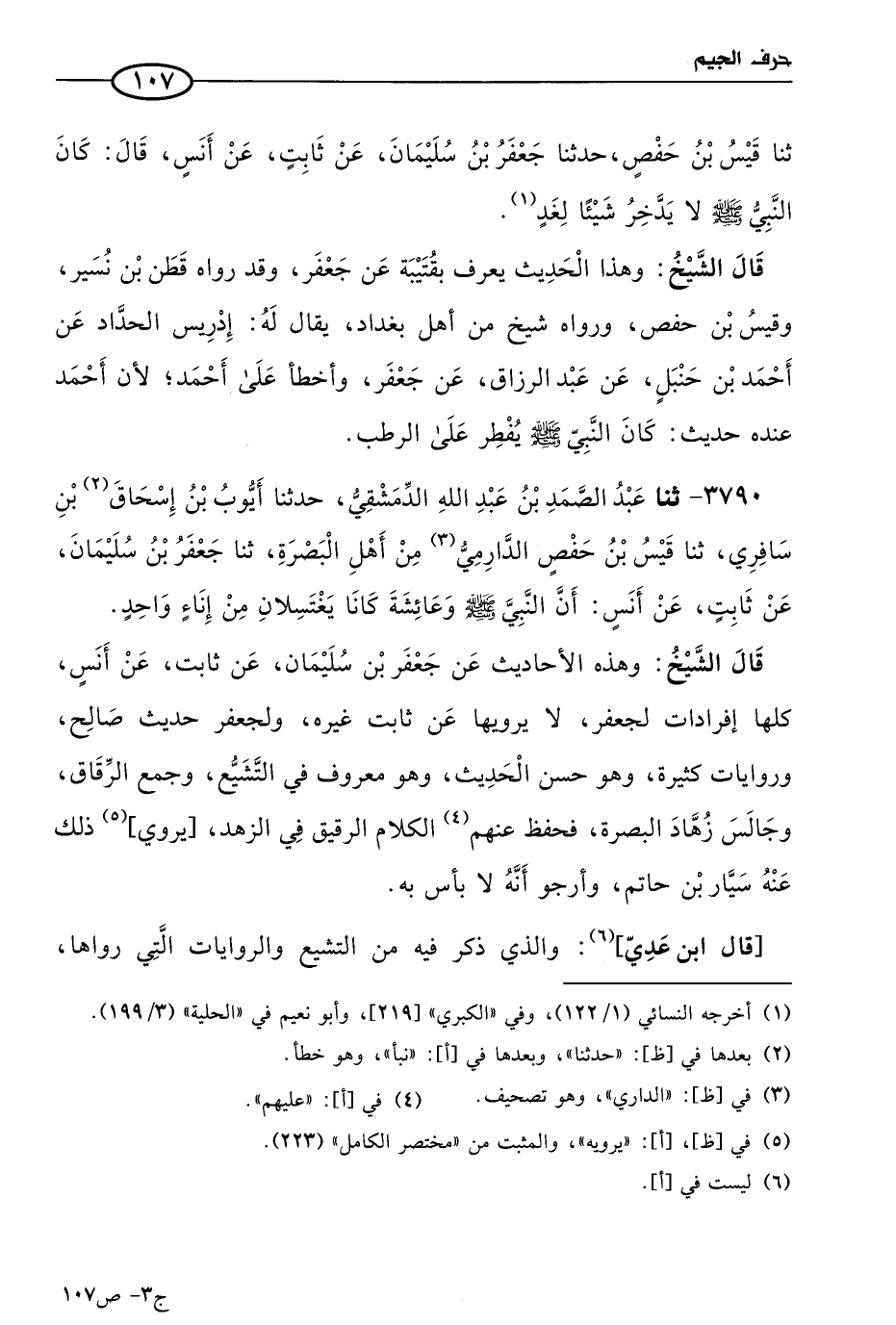قال الشيخ: وهذه الأحاديث عن جعفر بن سليمان، عن ثابت عن أَنَس كلها إفرادات لجعفر، لا يرويها عن ثابت غيره، ولجعفر حديث صالح وروايات كثيرة، وهو حسن الحديث، وهو معروف بالتشيع وجمع الرقاق، وجالس زهاد البصرة فحفظ عنهم الكلام الرقيق في الزهد، يروي ذلك عنه سيار بن حاتم، وأرجو أنه لا بأس به.