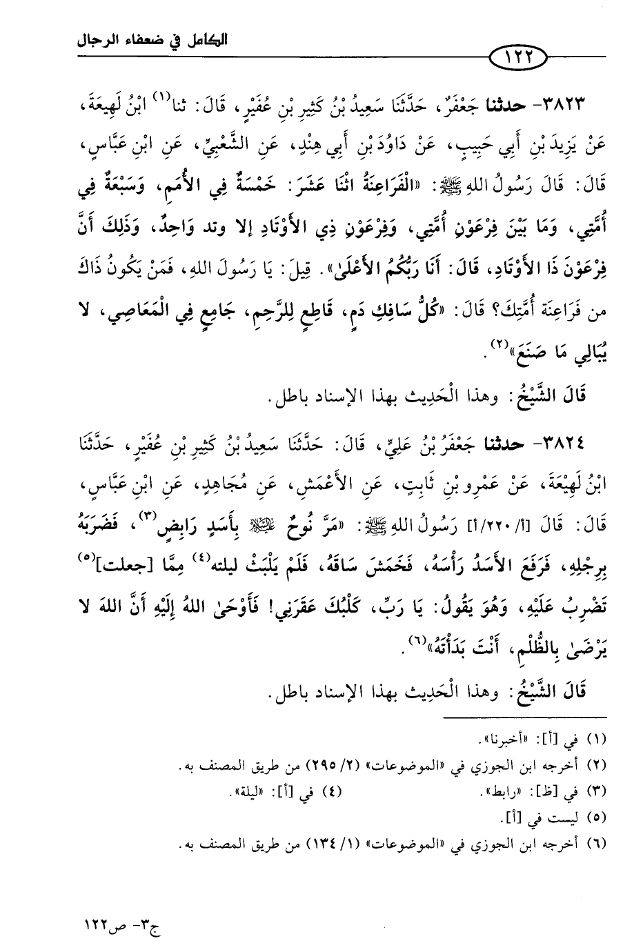 3823 - حَدثنا جعفر، حَدثنا سعيد بن كثير بن عفير، قال: حدثنا ابن لَهِيعَة، عن يزيد بن أبي حبيب عن داود بن أبي هند عن الشعبي، عن ابن عباس، قال: قال رسول الله صَلى الله عَليه وسَلم: الفراعنة اثنا عشر: خمسة في الأمم، وسبعة في أُمَّتِي، وما بين فرعون أُمَّتِي وفرعون ذي الأوتاد إلا وتد واحد، وذلك أن فرعون ذا الأوتاد قال: أنا ربكم الأعلى، قيل: يا رسول الله، فمن يكون ذاك من فراعنة أمتك، قال: كل سافك دم قاطع للرحم جامع في المعاصي لا يبالي ما صنع.