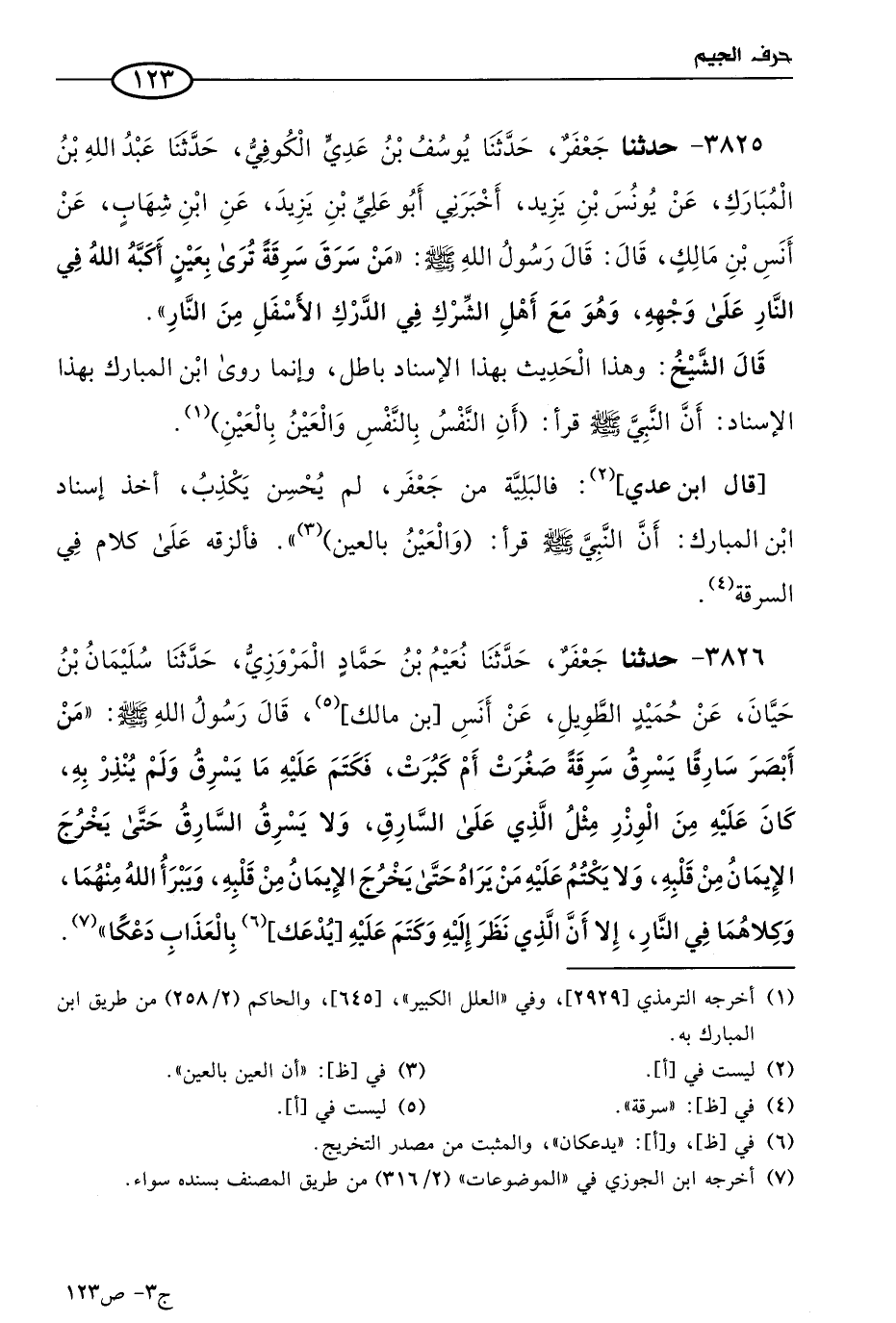 3825 - حَدثنا جعفر، حَدثنا يوسف بن عدي الكوفي، حَدثنا عَبد الله بن المبارك، عن يُونُس بن يزيد، أخبرني أَبو علي بن يزيد، عن ابن شهاب، عن أَنَس بن مالك، قال: قال رسول الله صَلى الله عَليه وسَلم: من سرق سرقة تُرَى بعين، أكبه الله في النار على وجهه، وهو مع أهل الشرك في الدرك الأسفل من النار.