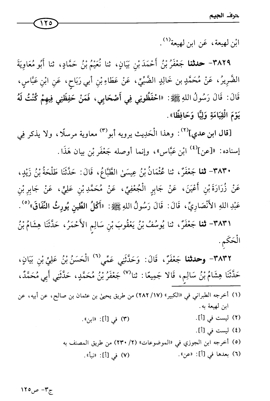 3829 - حَدثنا جعفر بن أحمد بن بيان، حَدثنا نعيم بن حماد، حَدثنا أَبو معاوية الضرير، عن مُحمد بن خالد الضبي، عن عطاء بن أبي رباح، عن ابن عباس، قال: قال رسول الله صَلى الله عَليه وسَلم: احفظوني في أصحابي فمن حفظني فيهم كنت له يوم القيامة وليا وحافظا.