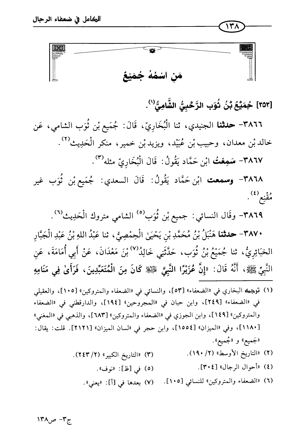 3868 - وسمعتُ ابن حماد يقول: قال السعدي: جميع بن ثوب غير مقنع.