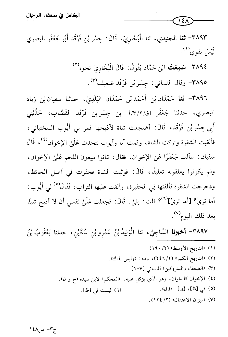3896 - حَدثنا حمدان بن أحمد بن حمدان البلدي، حَدثنا سفيان بن زياد البصري، حَدثنا جعفر بن جسر بن فرقد القصاب، حَدَّثني أبي جسر بن فرقد قال: أضجعت شاة لأذبحها فمر بي أيوب السختياني فألقيت الشفرة وتركت الشاة وقمت أنا وأيوب نتحدث على الإخوان،- قال سفيان: سألت جعفرا عن الإخوان، فقال: كانوا يبيعون اللحم على الإخوان، ولم يكونوا يعلقونه تعليقا -، قال: فوثبت الشاة فحفرت في أصل الحائط، ودحرجت الشفرة فألقتها في الحفيرة، وألقت عليها التراب، فقال لي أيوب: أما ترى؟ أما ترى؟ قلت: بلى. قال: فجعلت على نفسي ألا أذبح شيئا بعد ذلك اليوم.