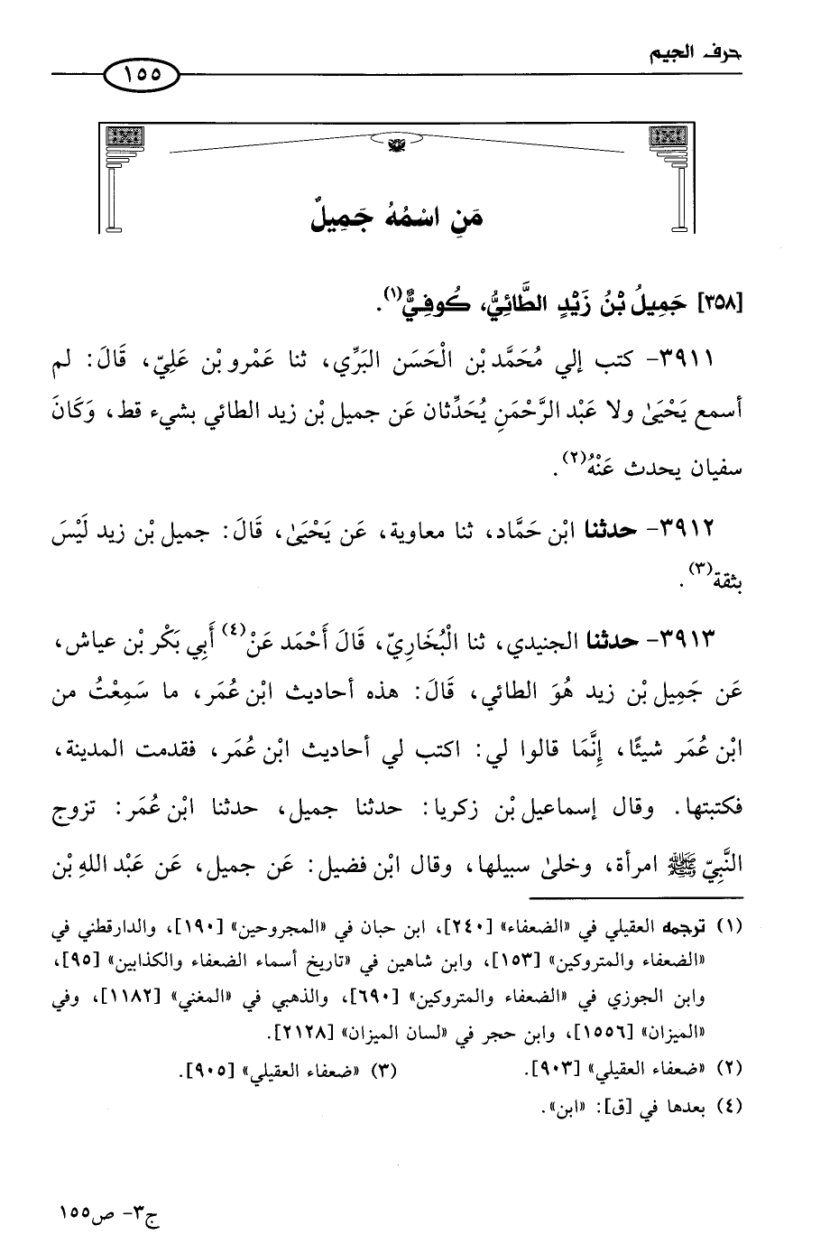3913 - حَدثنا الجنيدي، حَدثنا البُخاري، قال أحمد: عن أبي بكر بن عياش، عن جميل بن زيد، هو الطائي، قال: هذه أحاديث ابن عُمر، ما سمعت من ابن عُمر شيئا، إنما قالوا لي: اكتب أحاديث ابن عُمر (1)، فقدمت المدينة فكتبتها. وقال إسماعيل بن زكريا: حَدثنا جميل، حَدثنا ابن عُمر؛ تزوج النبي صَلى الله عَليه وسَلم امرأة وخلى سبيلها. وقال ابن فضيل: عن جميل، عن عَبد الله بن كعب. وقال عباد بن العوام: حَدثنا جميل، سمع كعب بن زيد، عن النبي صَلى الله عَليه وسَلم. وقال القاسم بن مالك: عن جميل؛ أنه سمع كعب بن زيد، أو زيد بن كعب، ولم يصح حديثه.