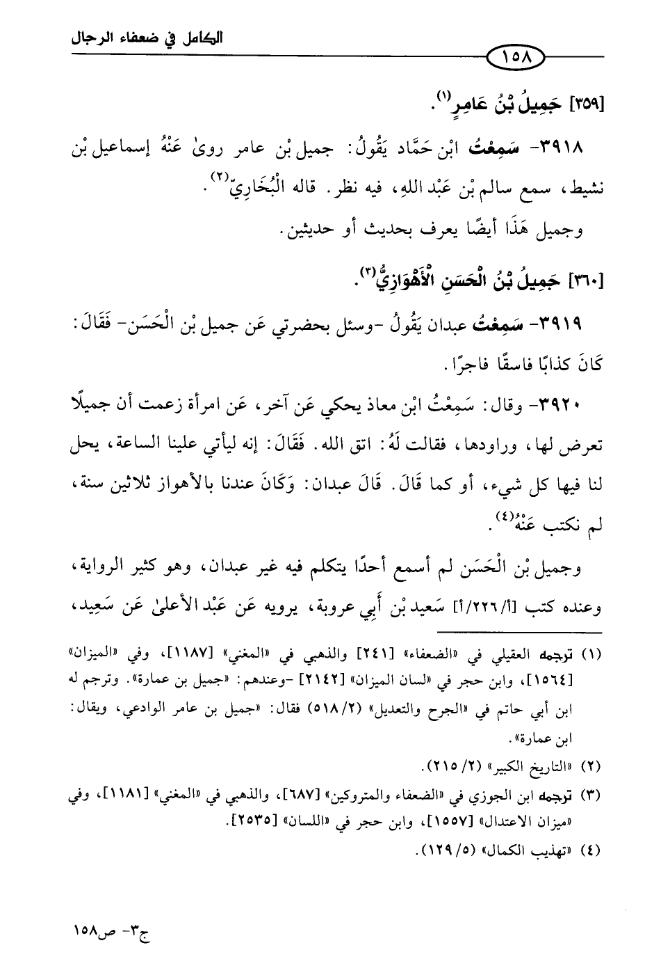 3918 - سمعتُ ابن حماد يقول: جميل بن عامر روى عنه إسماعيل بن نشيط، سمع سالم بن عَبد الله، فيه نظر. قاله البُخاري.