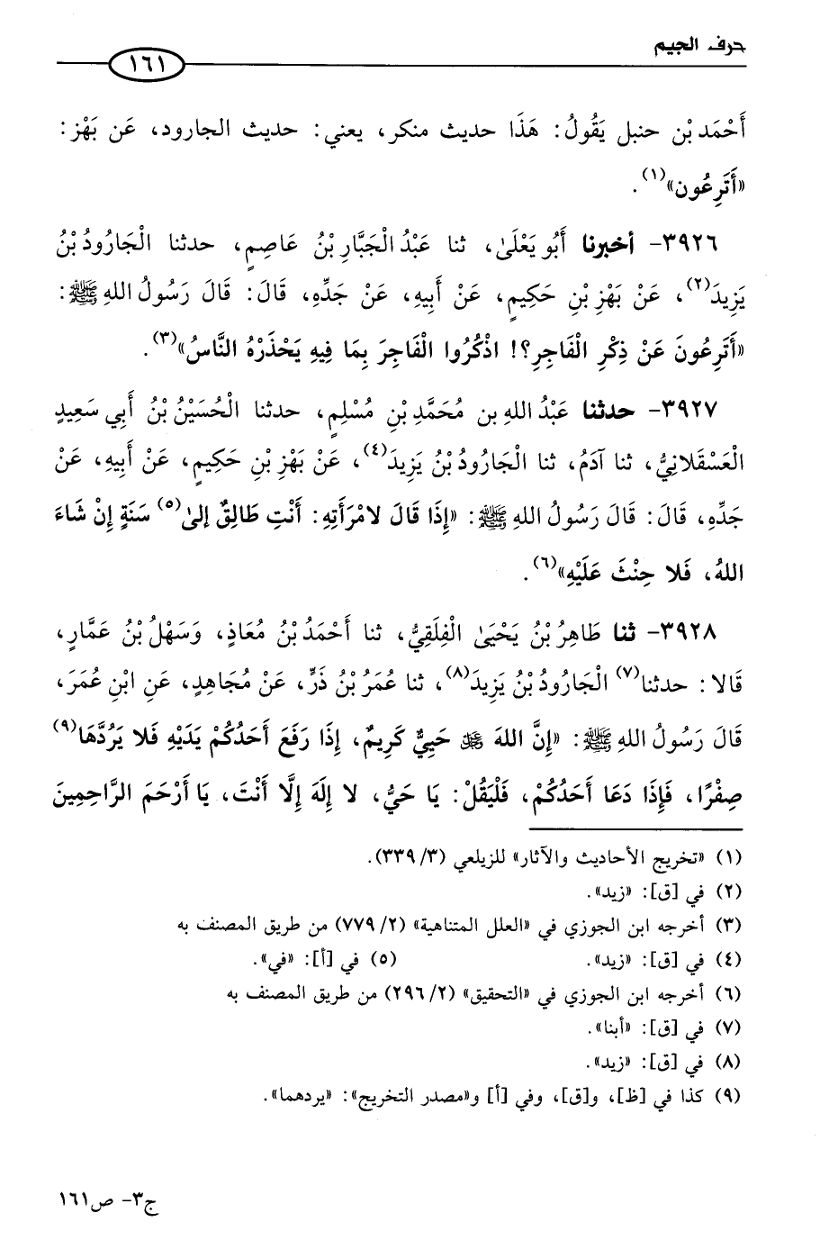 3926 - أخبرنا أَبو يَعلَى، حَدثنا عَبد الجبار بن عاصم، حَدثنا الجارود بن يزيد، عن بهز بن حكيم، عن أبيه، عن جَدِّهِ، قال: قال رسول الله صَلى الله عَليه وسَلم: أترعون عن ذكر الفاجر؟! اذكروا الفاجر بما فيه، يحذره الناس.