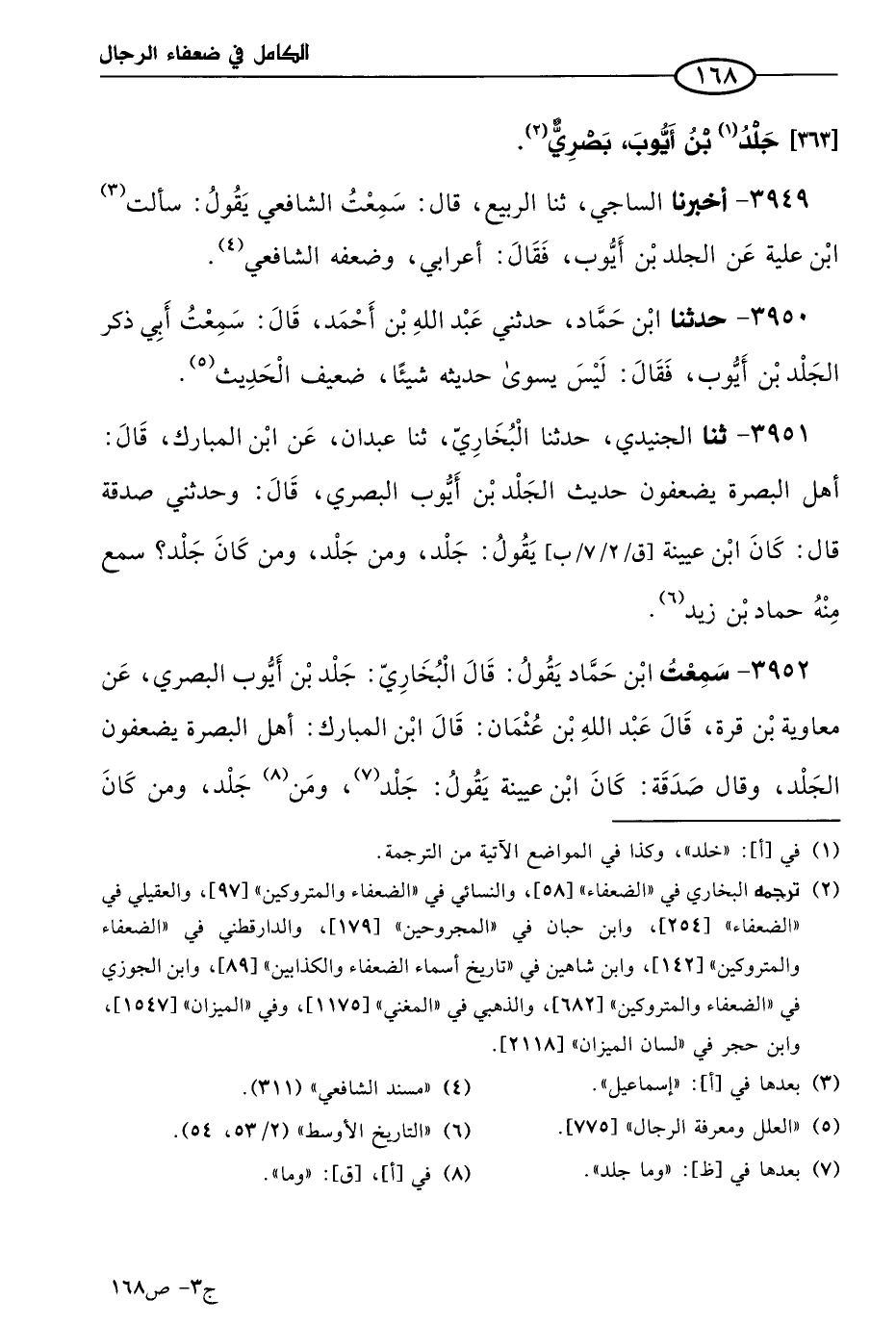 3951 - حَدثنا الجنيدي، حَدثنا البُخاري، حَدثنا عبدان، عن ابن المبارك قال: أهل البصرة يضعفون حديث الجلد بن أيوب البصري، قال: وحدثني صدقة، قال: كان ابن عُيَينة يقول: جلد، ومن جلد؟ ومن كان جلد؟ سمع منه حماد بن زيد.
