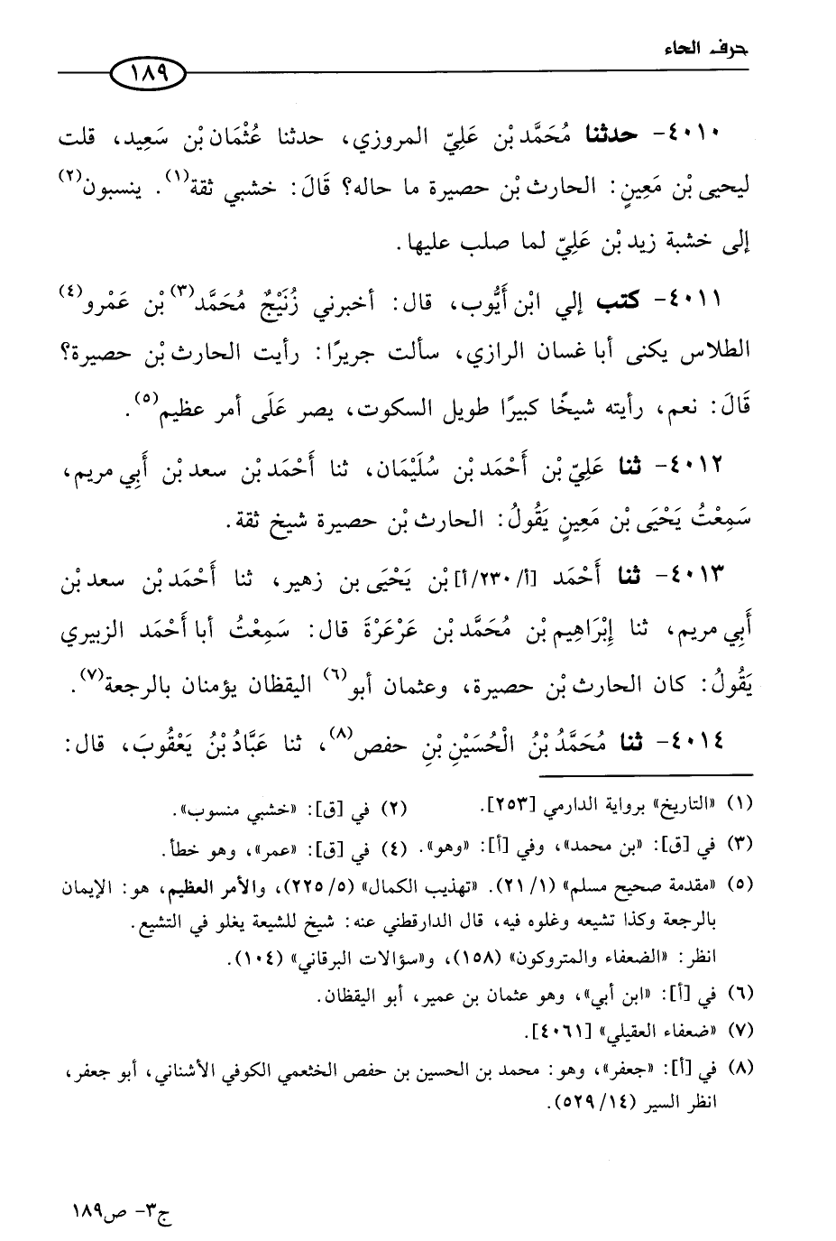 4013 - حَدثنا أحمد بن يَحيى بن زهير، حَدثنا أحمد بن سعد بن أبي مريم، حَدثنا إبراهيم بن مُحمد بن عرعرة، قال: سمعتُ أبا أحمد الزبيري يقول: كان الحارث بن حصيرة وعثمان أَبو اليقظان يؤمنان بالرجعة.
