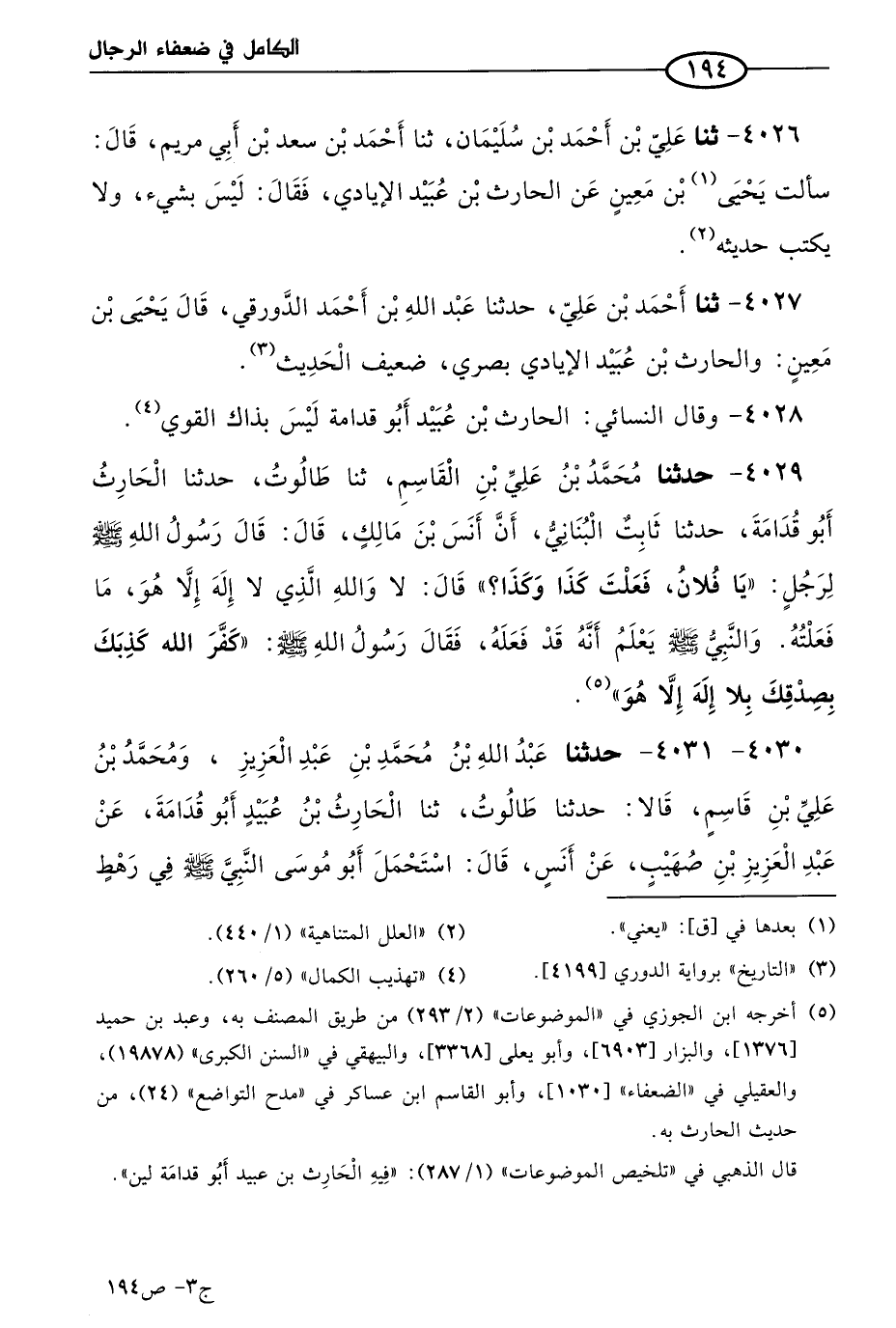 4027 - حَدثنا أحمد بن علي، حَدثنا عَبد الله بن أحمد الدورقي، قال يَحيى بن مَعين: والحارث بن عُبيد الإيادي بصري ضعيف الحديث.