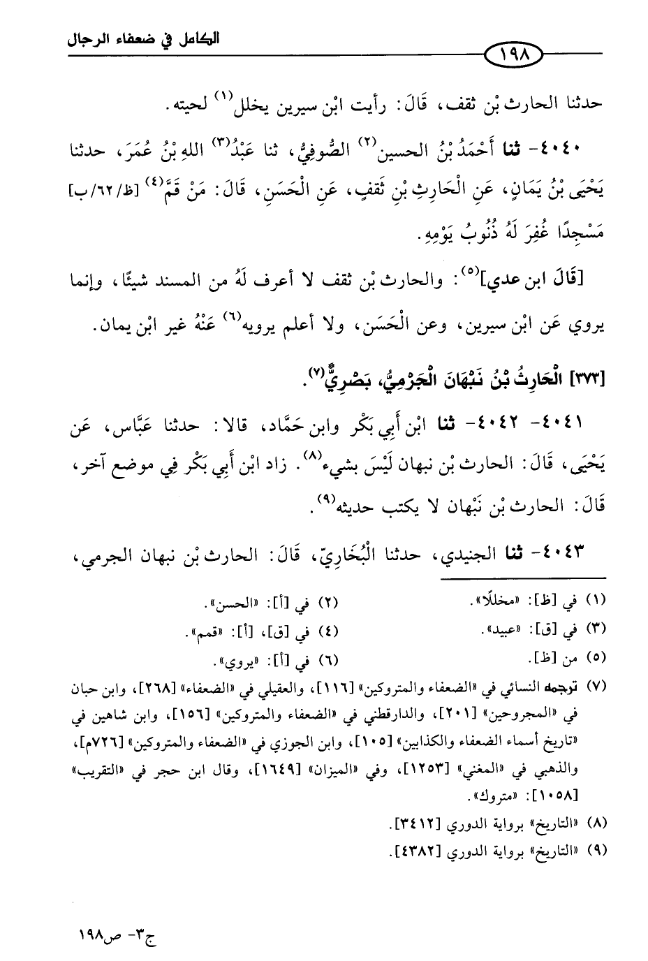 4043 - حَدثنا الجنيدي، حَدثنا البُخاري قال: الحارث بن نبهان الجرمي عن عاصم بن بهدلة، والأعمش منكر الحديث، نسبه مسلم.