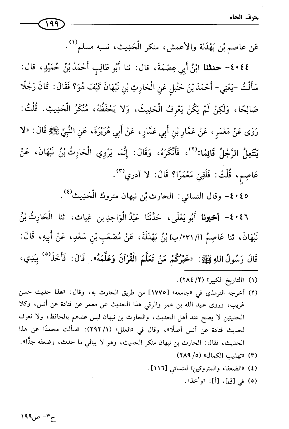 4044 - حَدثنا ابن أبي عصمة، قال: حَدثنا أَبو طالب أحمد بن حميد قال: سألت، يعني أحمد بن حنبل، عن الحارث بن نبهان، كيف هو؟ فقال: كان رجلاً صالحا، ولكن لم يكن يعرف الحديث ولا يحفظه، منكر الحديث، قلت: روى عن معمر، عن عمار بن أبي عمار، عن أبي هريرة، عن النبي صَلى الله عَليه وسَلم، قال: لا ينتعل الرجل قائما. فأنكره، وقال: إنما يروي الحارث بن نبهان، عن عاصم، قلت: فلقي معمرا؟ قال: لا أدري.